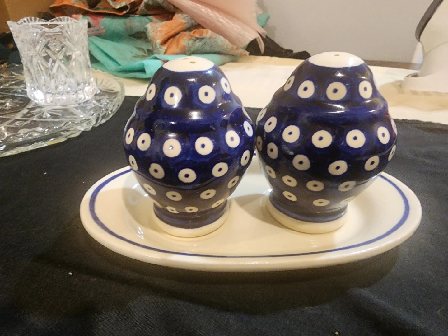 Here's a lovely set of ceramic salt and pepper shakers! They feature a charming blue and white polka dot pattern. Perfect for adding a touch of whimsy to your kitchen or dining table