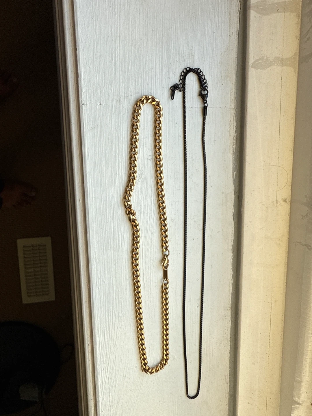 Selling a set of two necklaces! One is a gold chain and the other is a black chain. The gold chain has the brand HZMAN on the clasp. Both for $15 cash only