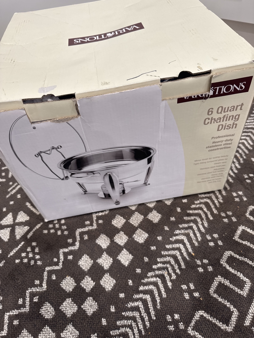 Selling a Variations 6 Quart Chafing Dish. It features a professional heavy-duty stainless steel construction. Also has a mirror finish for lasting beauty and a tight-fitting tempered glass lid with steam vent. Still on the box