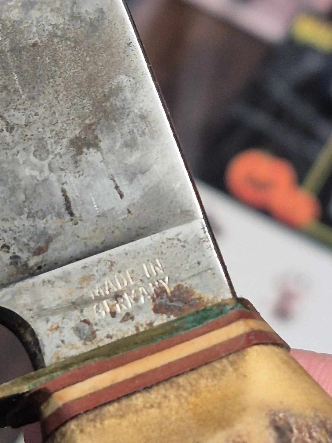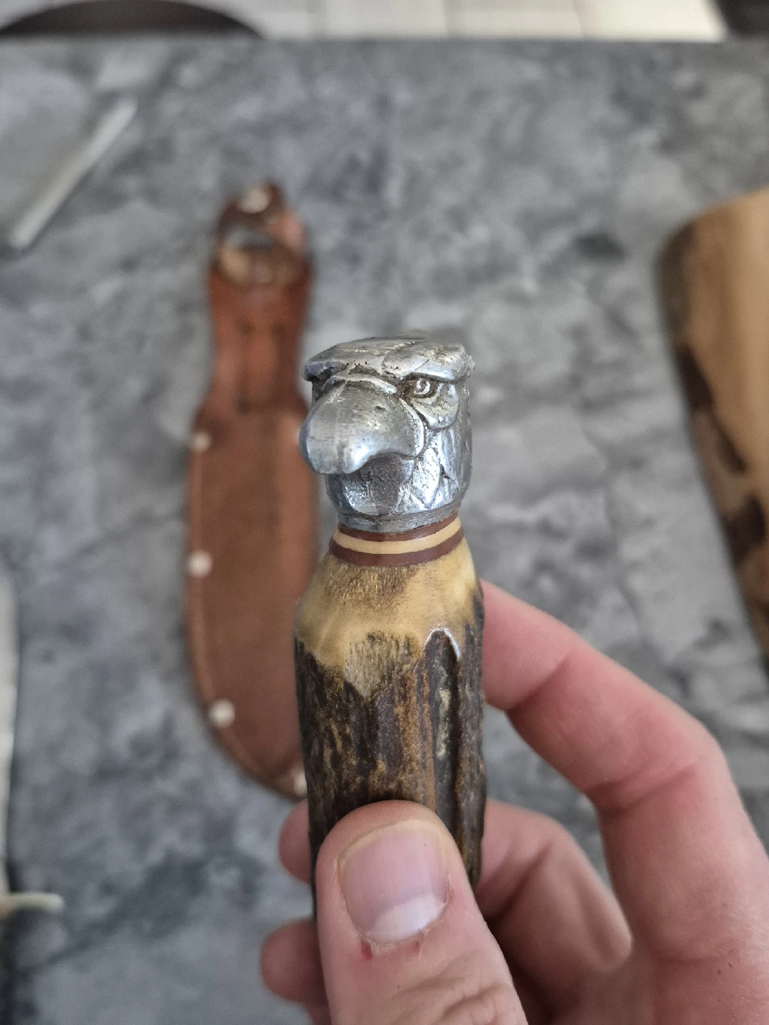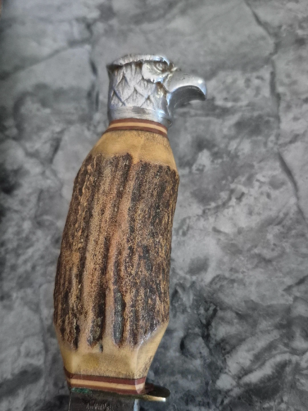 Selling a vintage hunting knife, marked "Made in Germany". It features a unique eagle head handle and comes with a leather sheath. A great piece for collectors!
