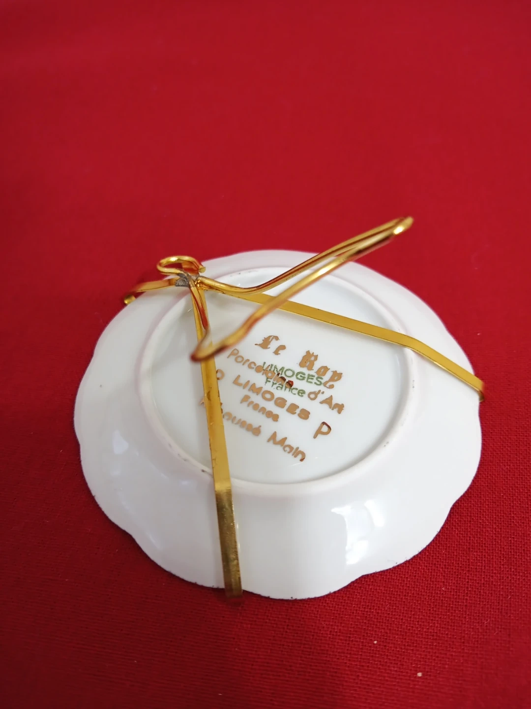 A decorative mini porcelain plate from Limoges, France. It features a charming scene of children and a dog. It's a beautiful piece for display!
