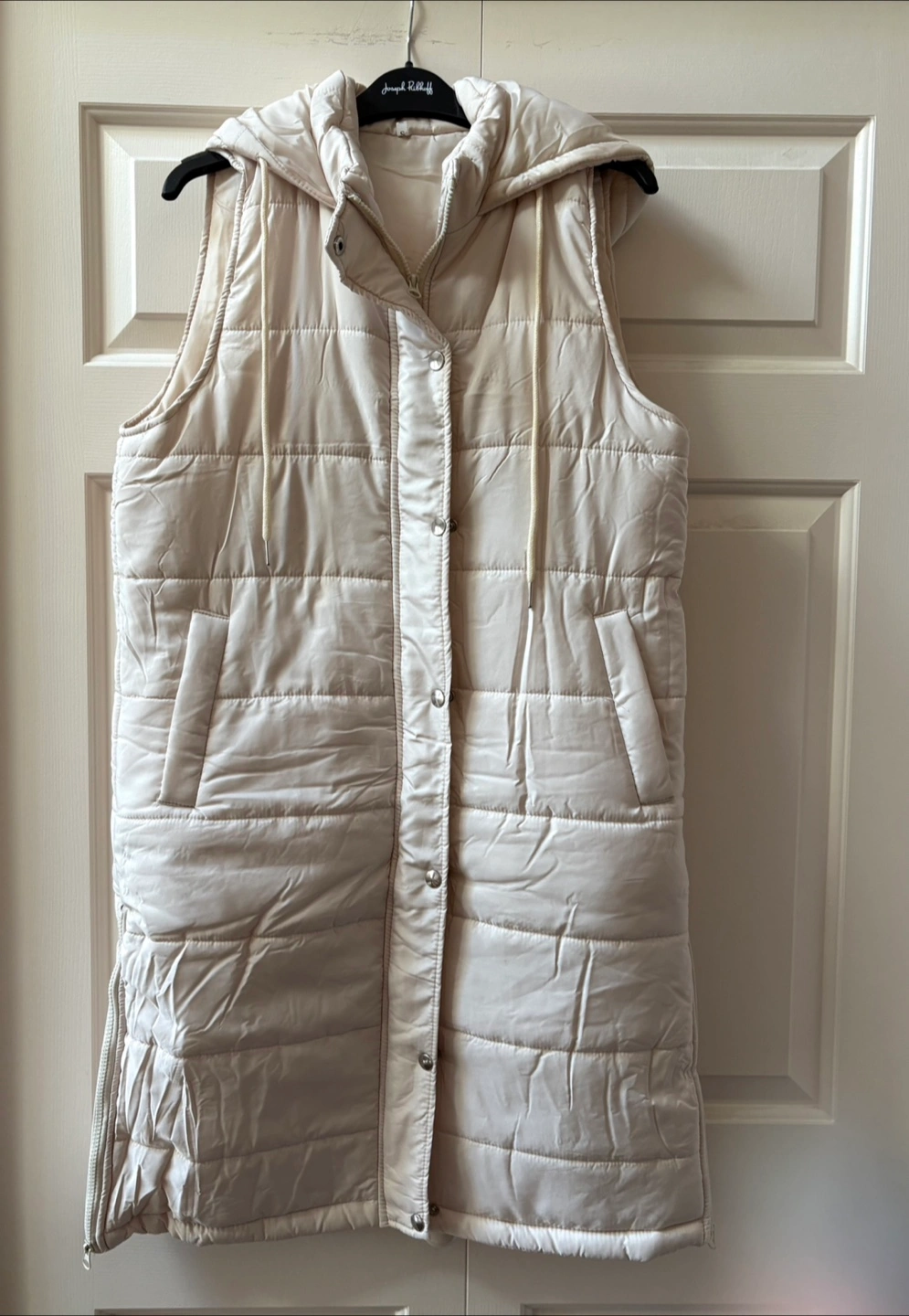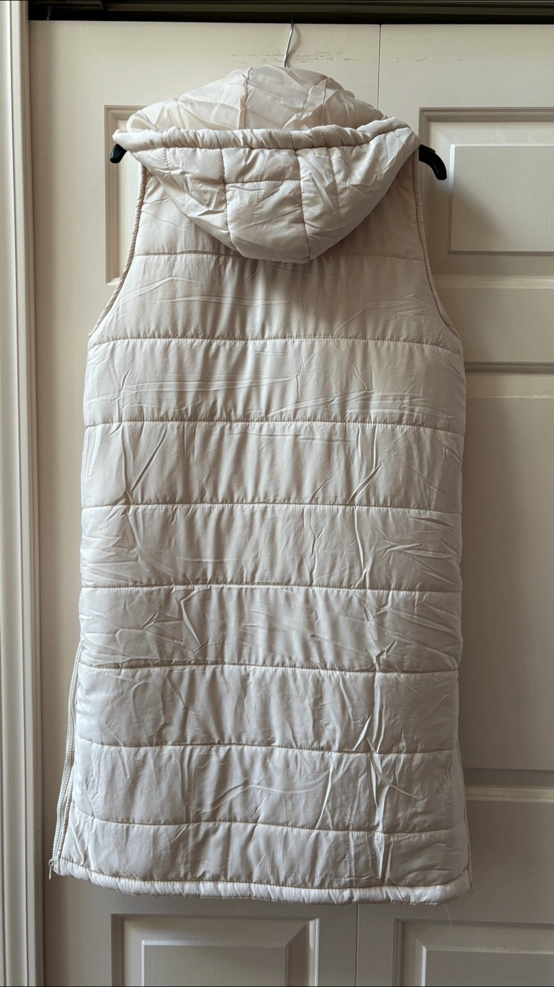 This hooded puffer vest is made from 65% cotton and 35% polyester.