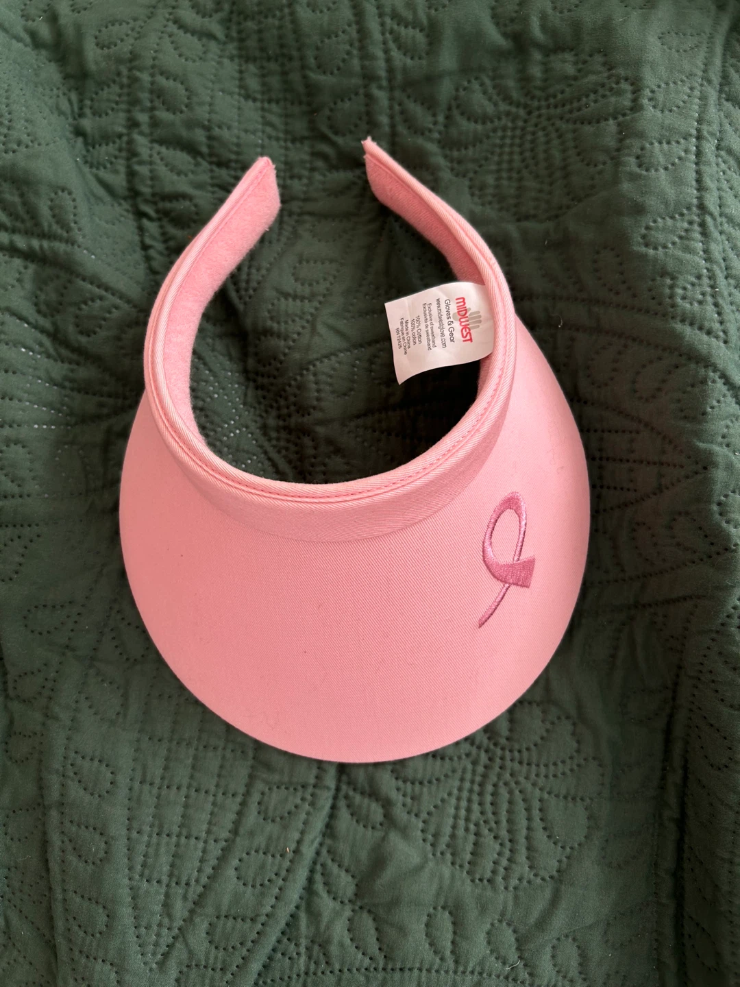 cute pink visor from Midwest Gloves & Gear! It's in great condition and perfect for sunny days. The sweatband is 100% cotton, making it super comfy to wear