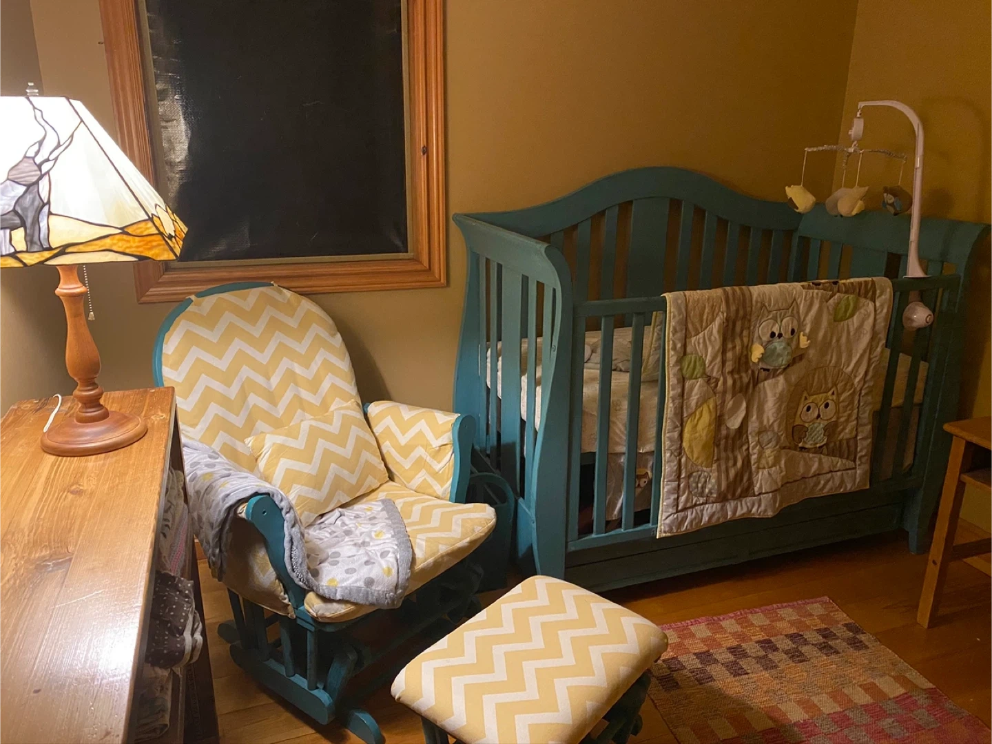 Selling a set of baby furniture including a crib, rocking chair with footstool, and a changing table. All items are in a matching teal colour. Perfect for setting up a nursery! Mattress and two fitted sheets are also included along with other accessories.