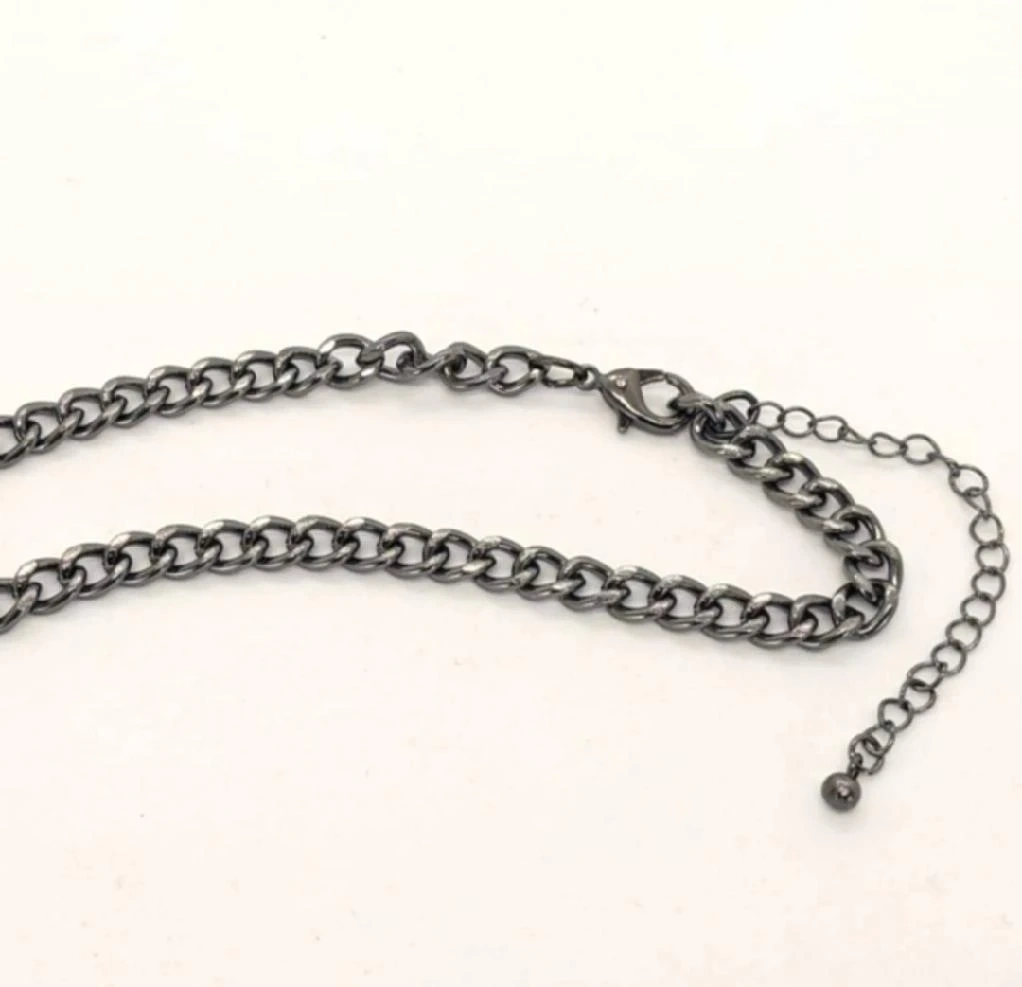 With a Far East look, This gorgeous necklace has a three tiered bib of golden & gunmetal chains, golden discs and orange red enamel embellishments with a gunmetal fringe.