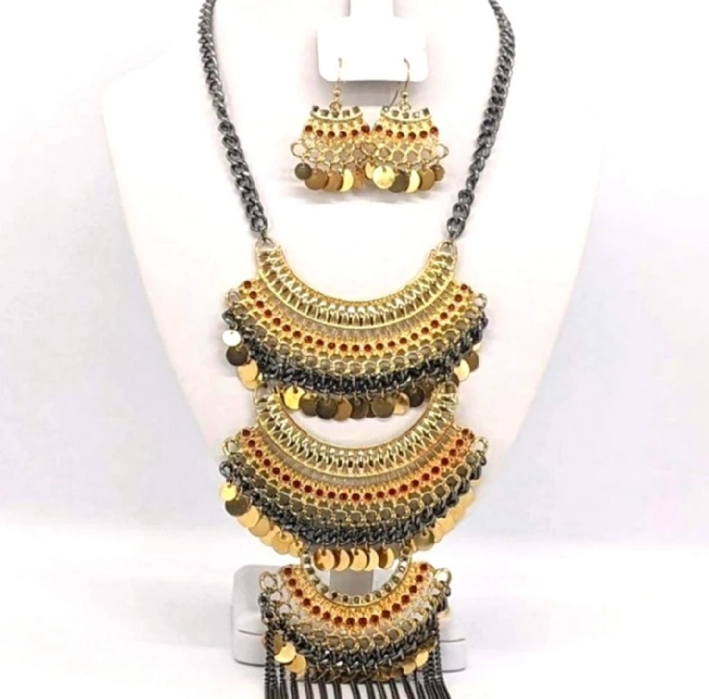 NEW✨ Gold Orange Red Gunmetal Fringe Necklace And Earring Set