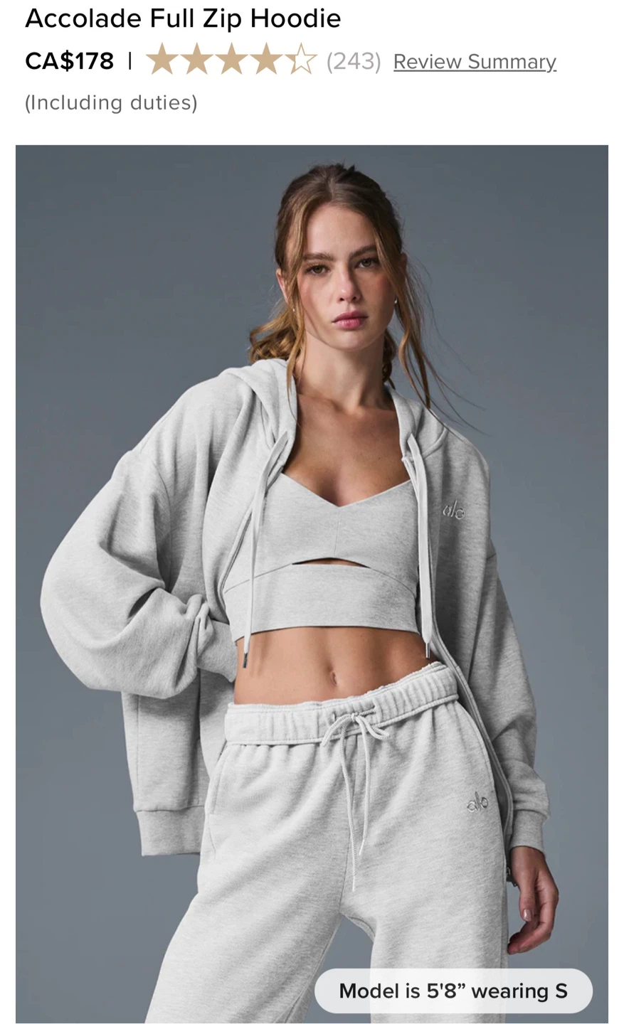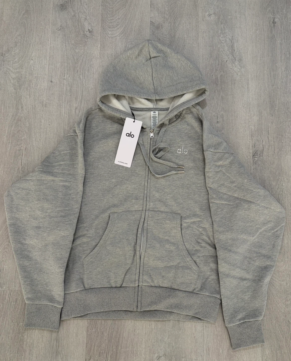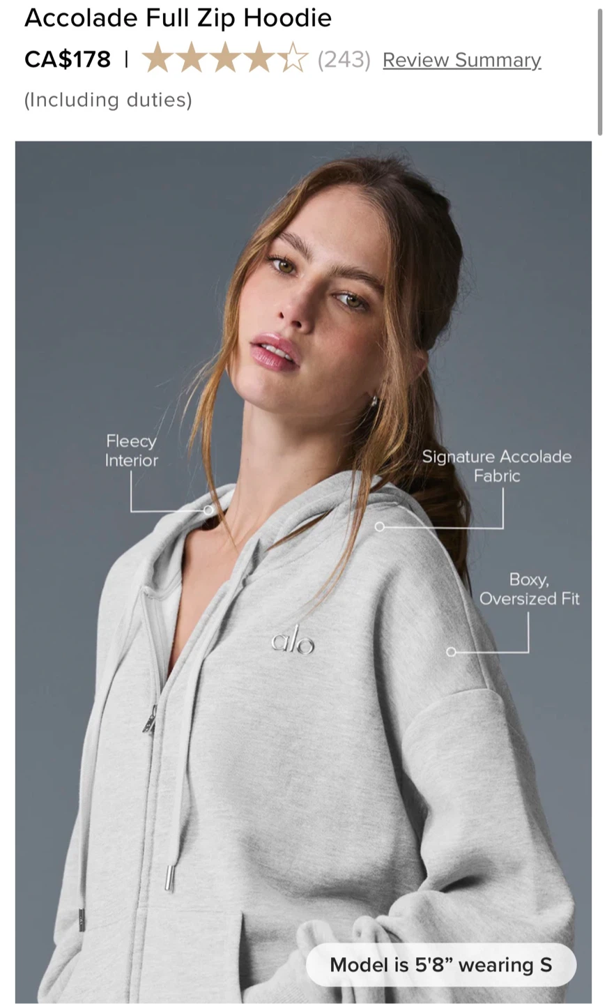 Selling a brand new ALO Accolade full zip hoodie in grey, brand new and authentic with tags. The hoodie features a fleecy interior and a boxy, oversized fit. It's made with signature Accolade fabric. Retails for CA$178!