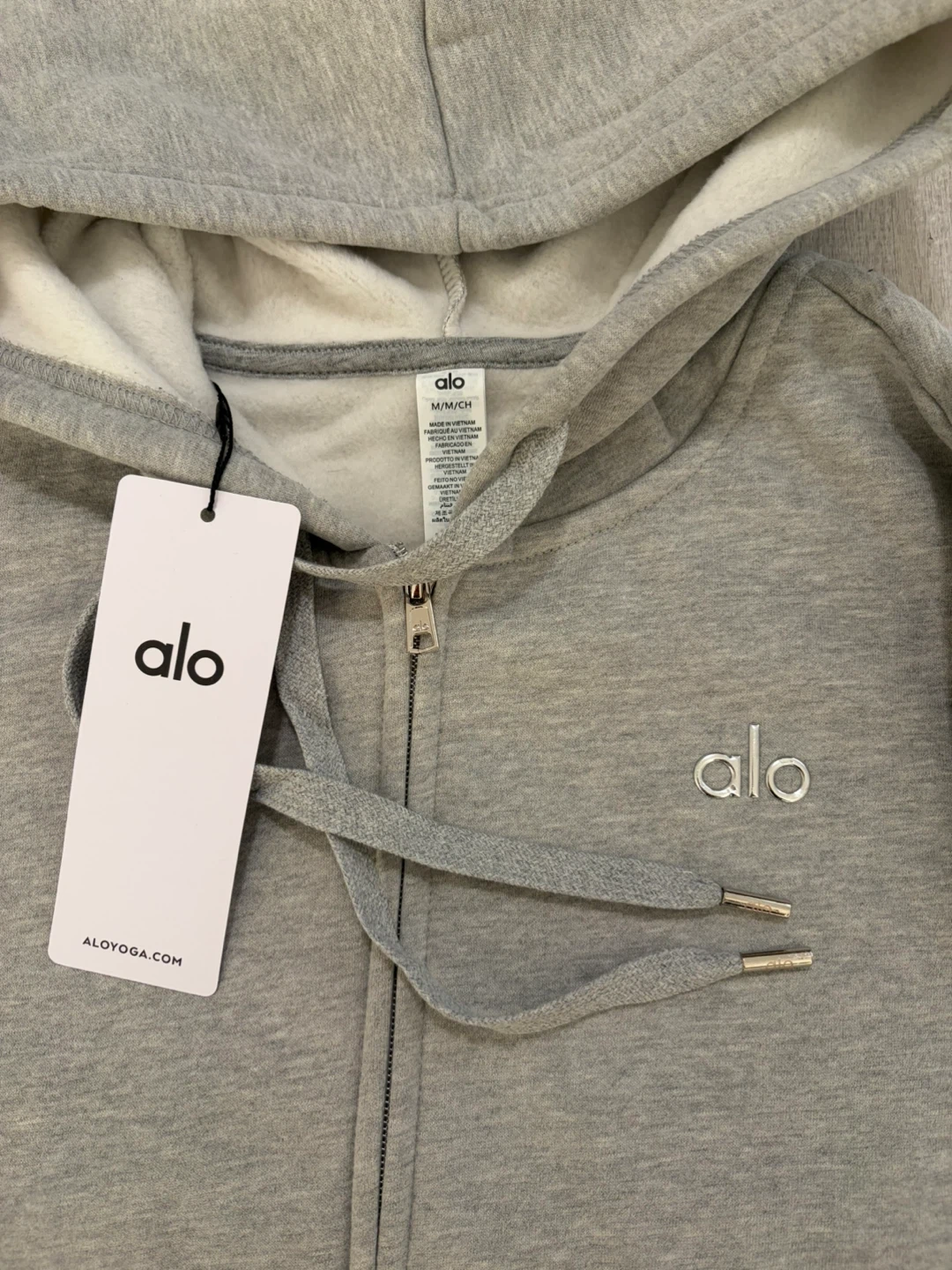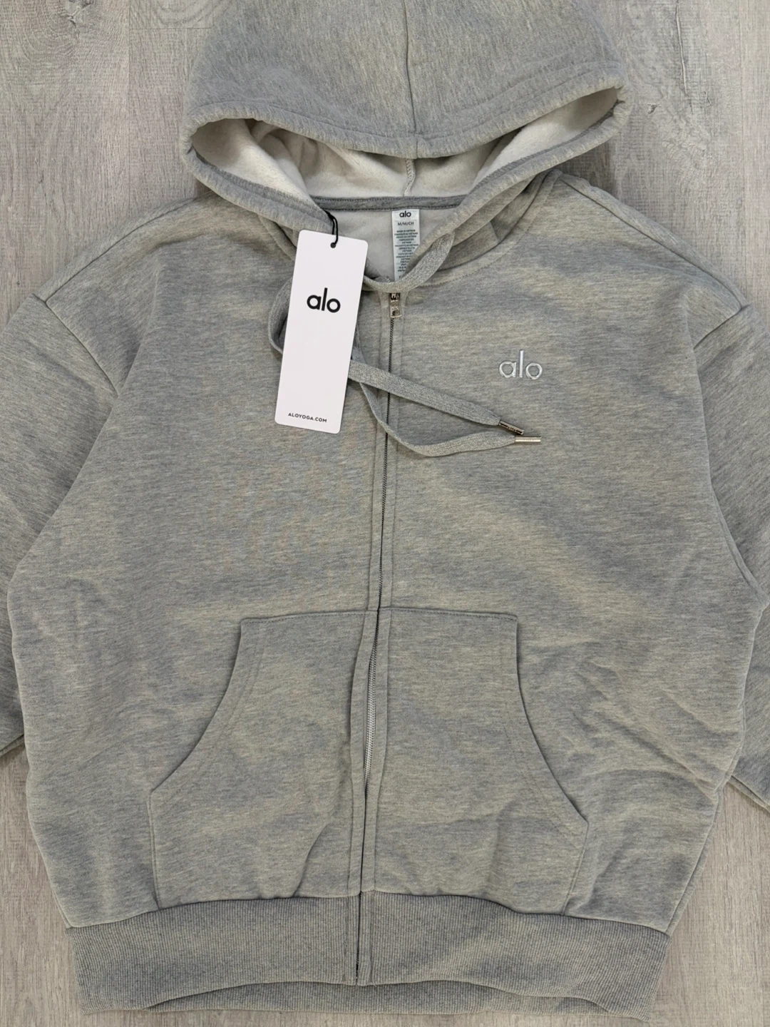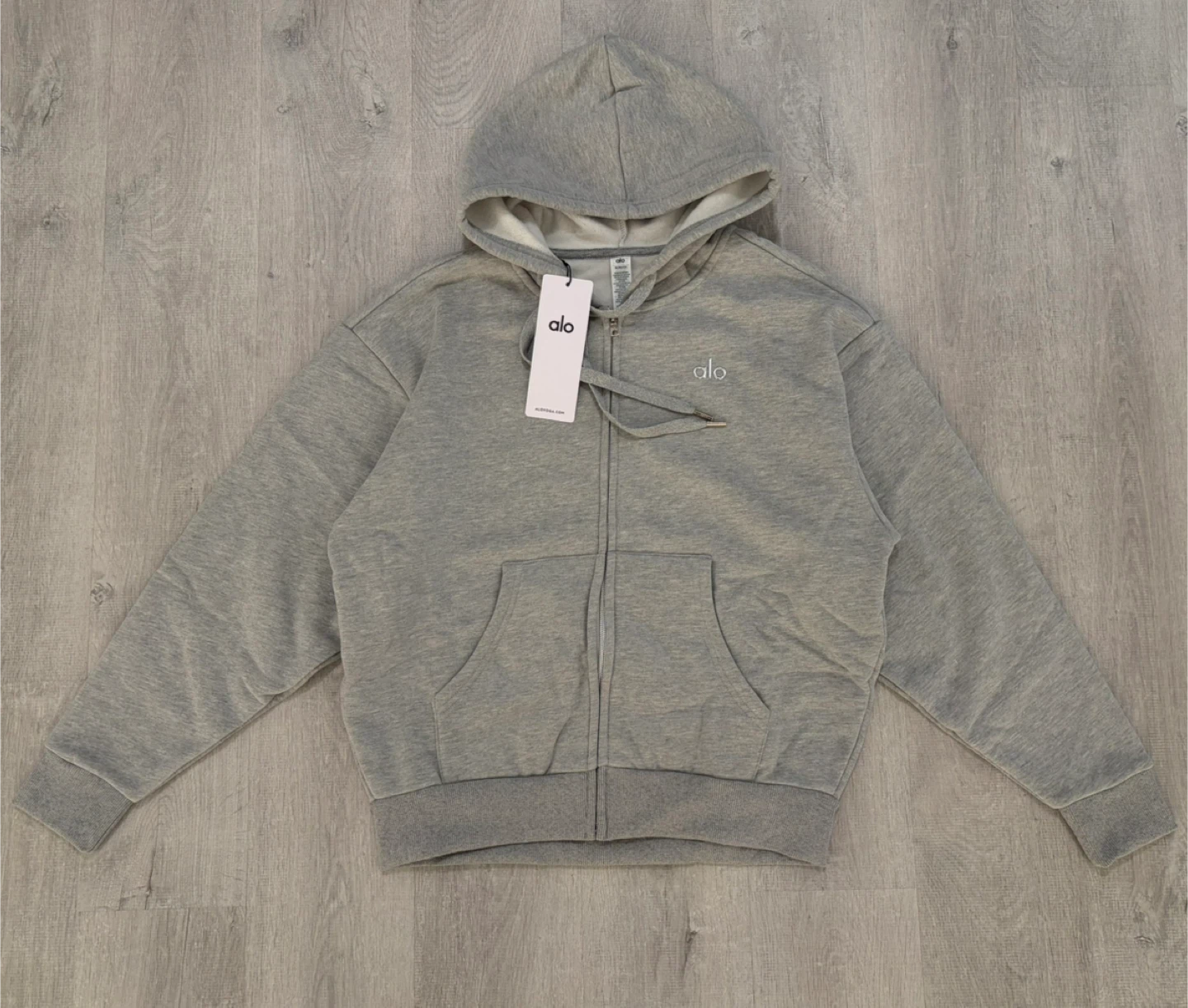 Selling a brand new ALO Accolade full zip hoodie in grey, brand new and authentic with tags. The hoodie features a fleecy interior and a boxy, oversized fit. It's made with signature Accolade fabric. Retails for CA$178!