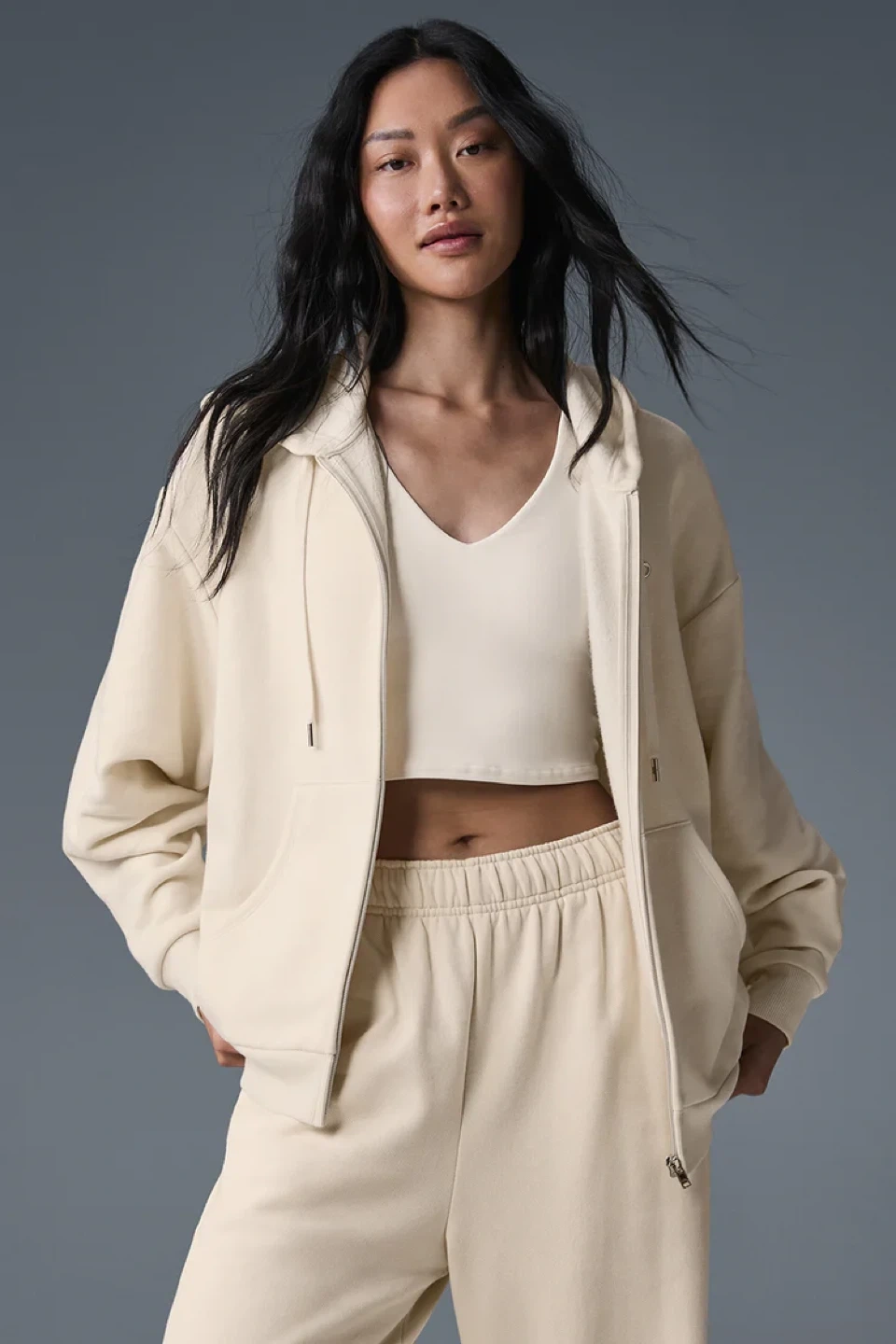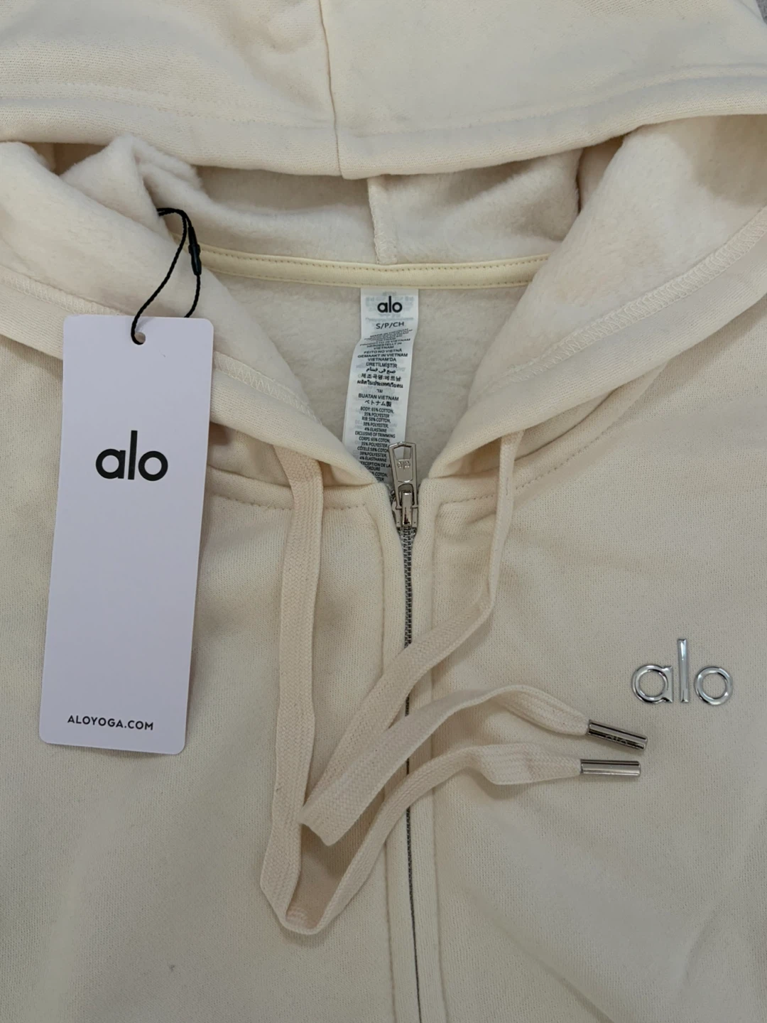 Selling a brand new ALO Accolade full zip hoodie in oat milk, small size, brand new and authentic with tags. The hoodie features a fleecy interior and a boxy, oversized fit. It's made with signature Accolade fabric. Retails for CA$178!
