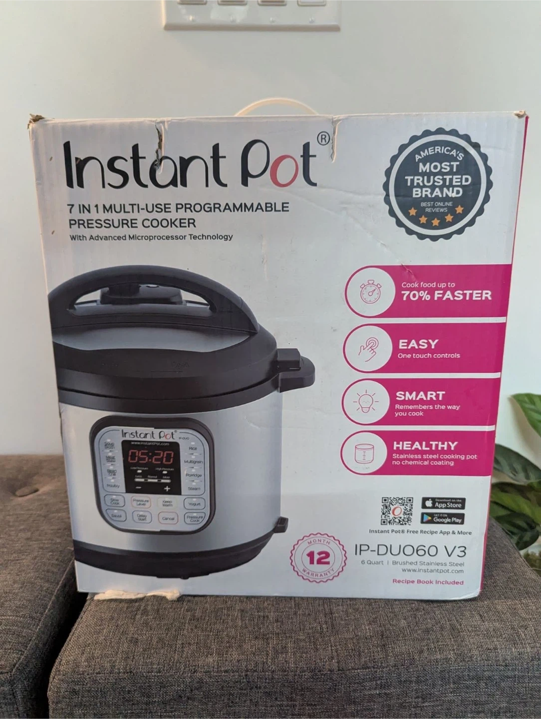 Selling an Instant Pot, 7-in-1 multi-use programmable pressure cooker. It's the IP-DUO60 V3 model with a 6-quart capacity. It can cook good fast and has one-touch controls. The box is included and pot is used only a couple of times, hence like new. Selling as downsizing. Pick up only.