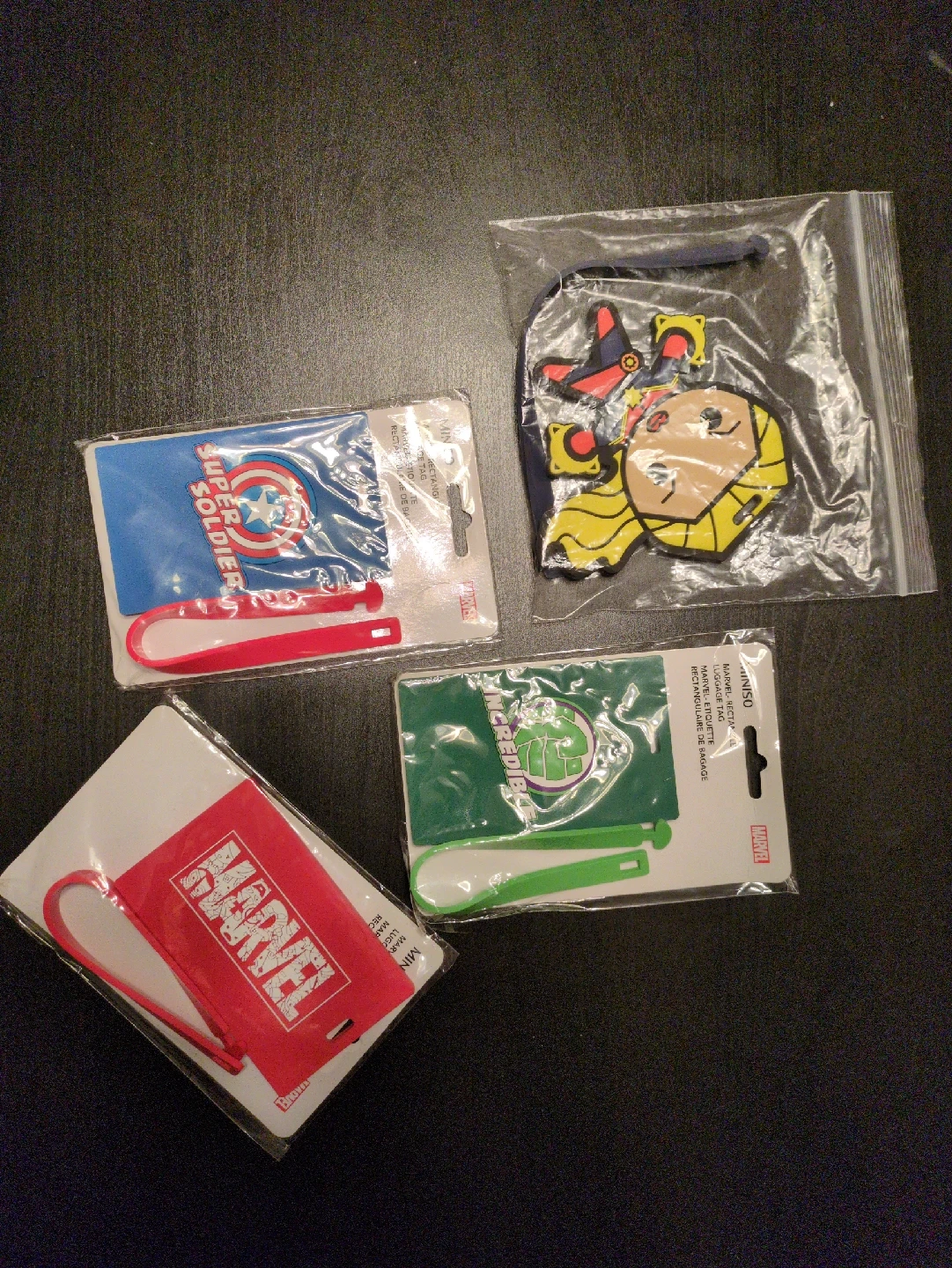 Selling a set of Marvel luggage tags! Includes Captain America (Super Soldier), Hulk (Incredible Hulk), and a Marvel logo tag. . All are still in their original packaging!