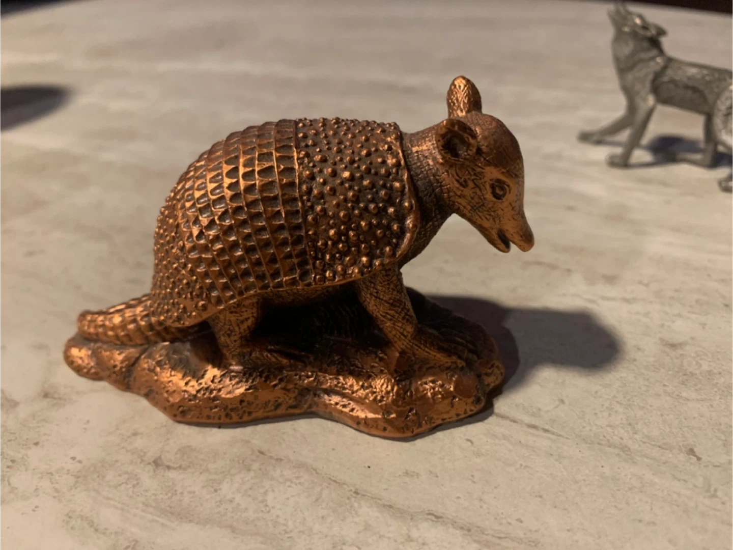 Here's a charming armadillo figurine! It has a lovely copper colour and would make a great addition to any collection or as a unique decorative piece