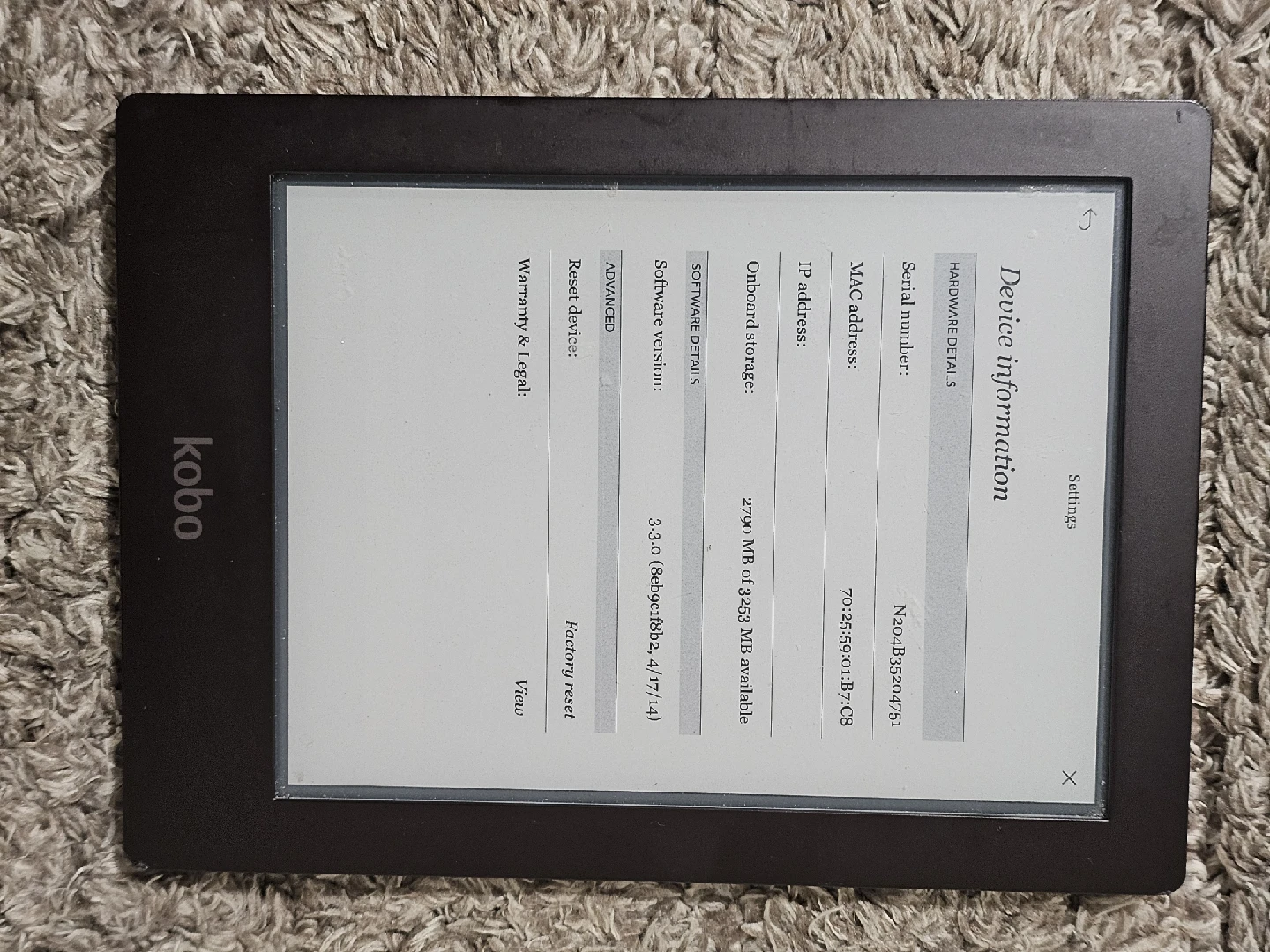 Selling my Kobo eReader! It's in great condition and ready for a new home. It has 2790 MB of onboard storage with 3253 MB available, so you'll have plenty of space for all your favourite books