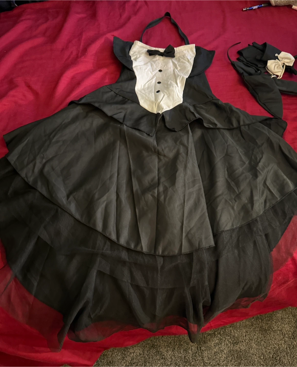 Selling a cute black and white Bunny cosplay. It comes with matching long gloves, ear headband, and a small bow accessory. Perfect for costumes or themed parties.