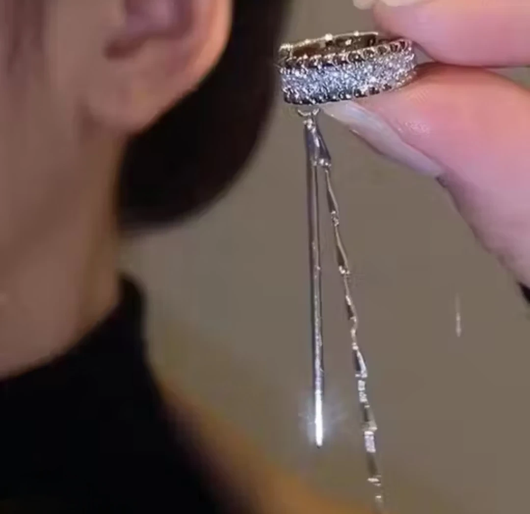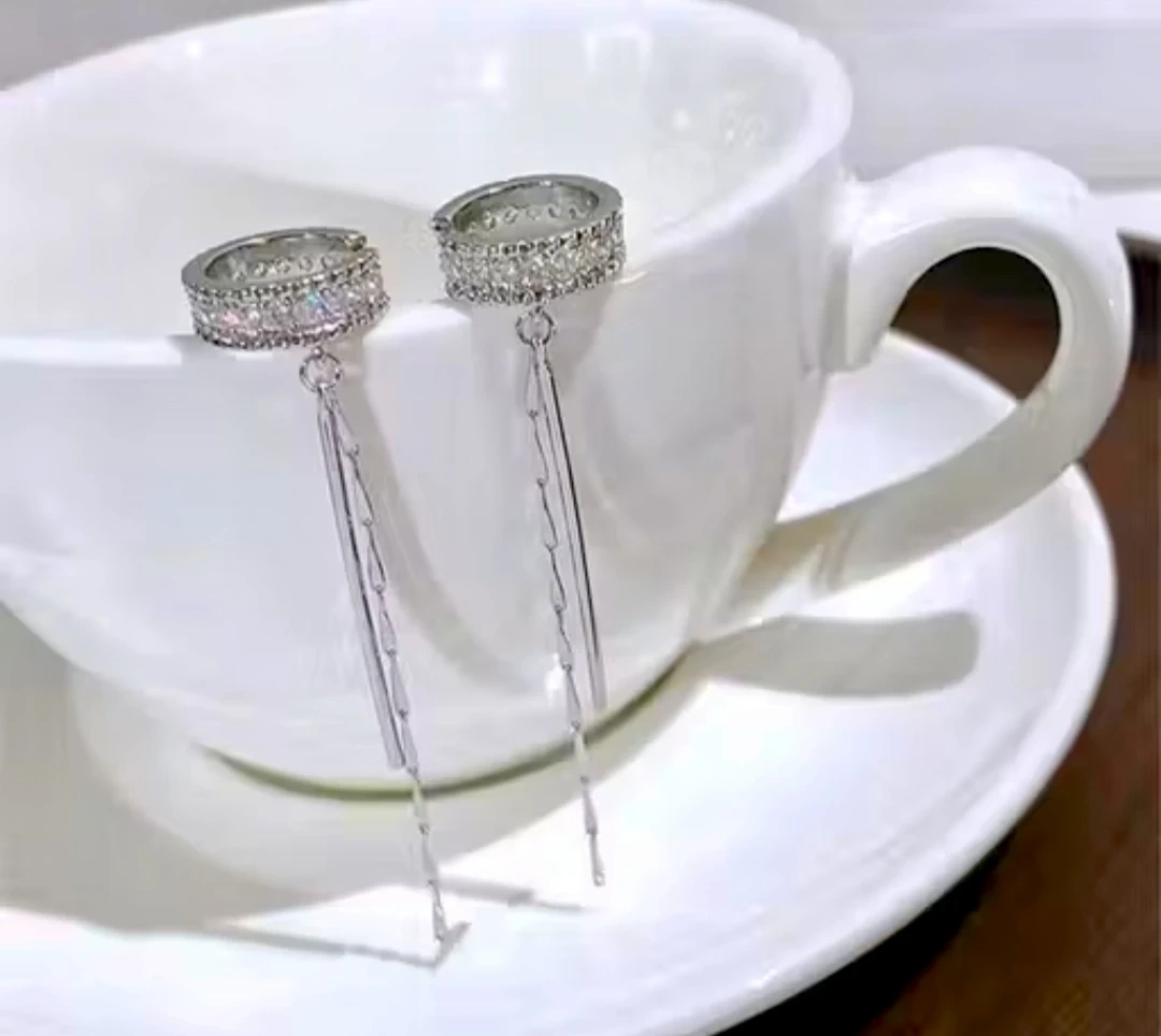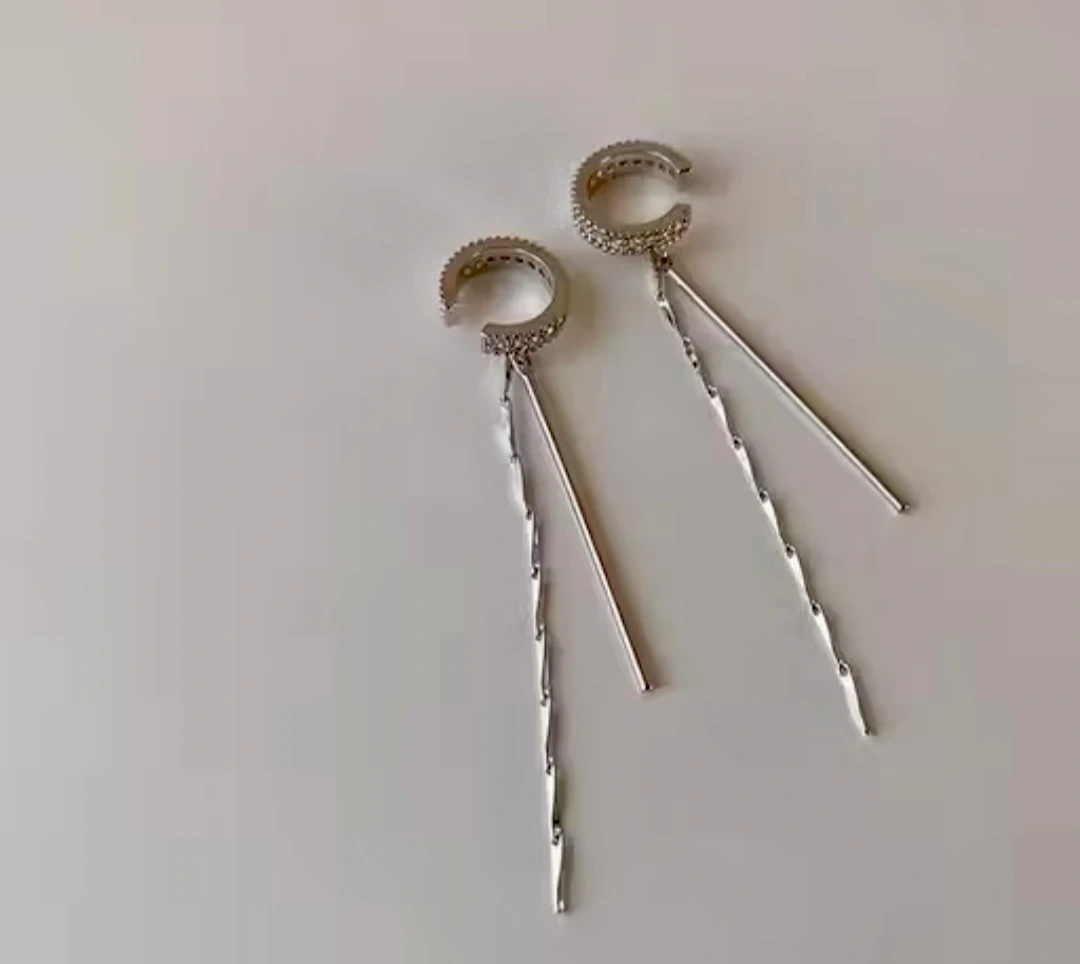10These are a pair of silver ear cuff earrings. They have a ring shape with dangling chains. They are in great condition and ready to wear!