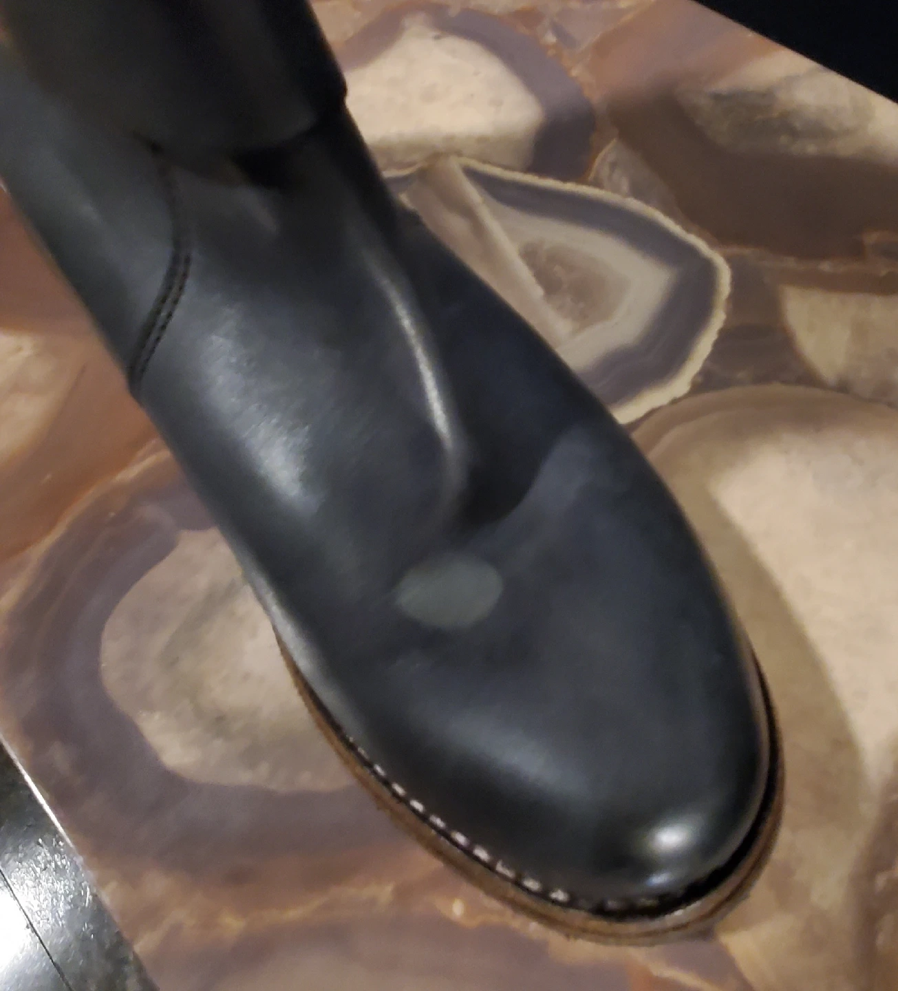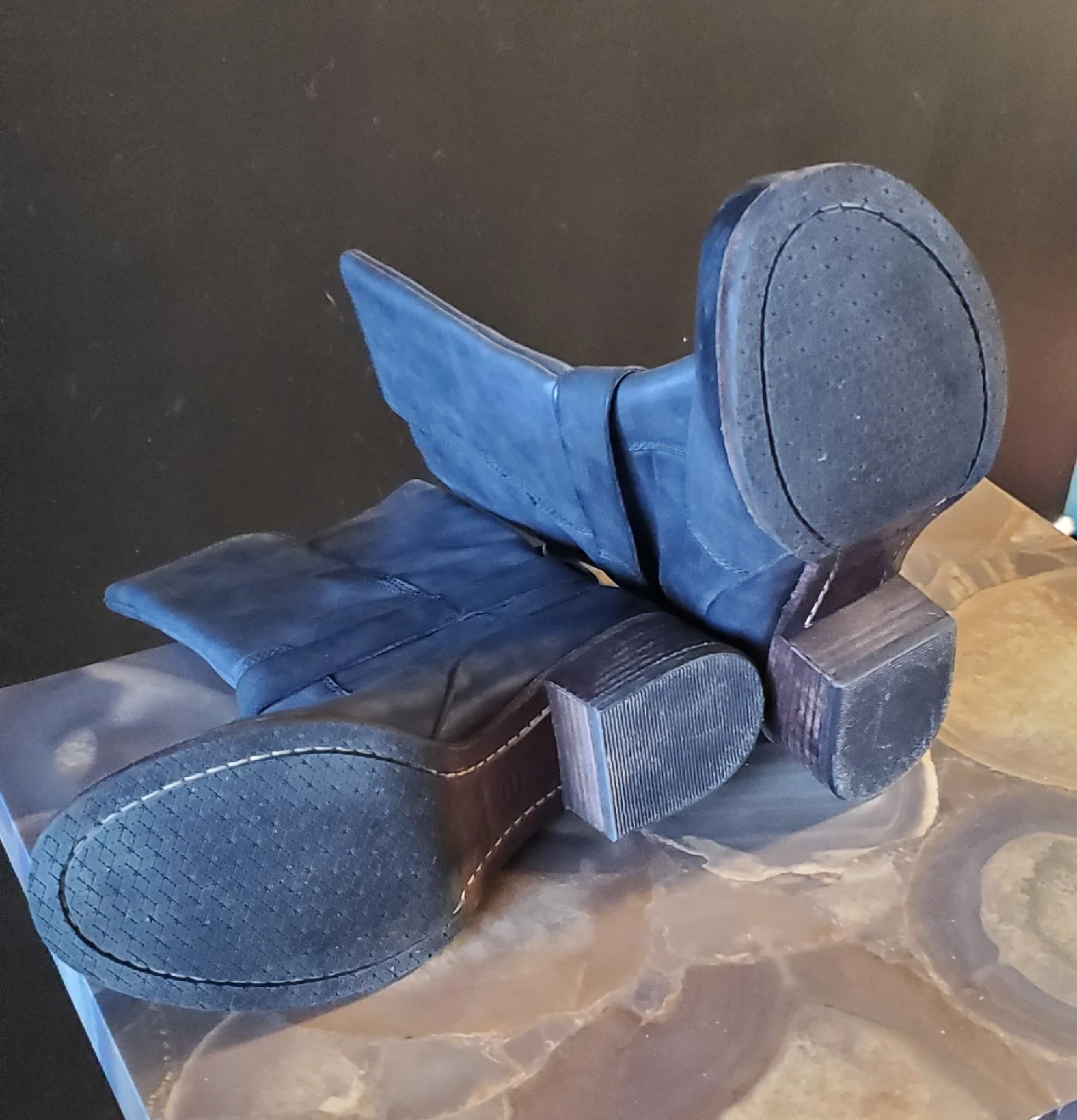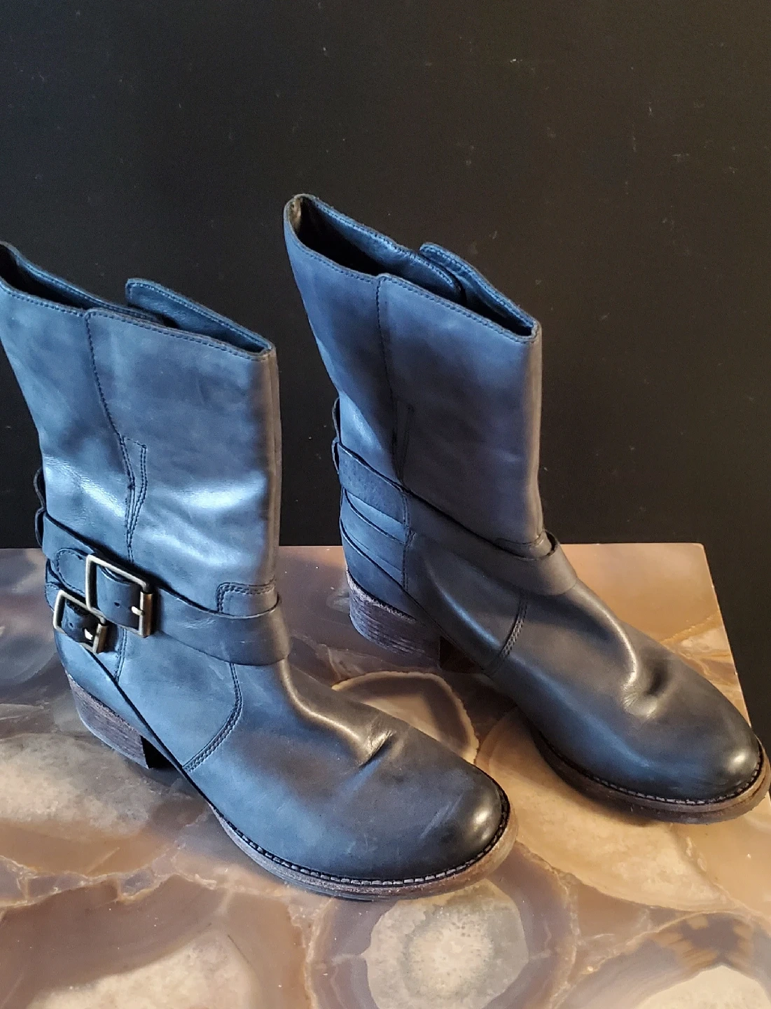 Genuine quality Leather. Super comfy. In excellent condition. Infrequent wear. Please note a spot on leather [Lt shoe]. Color Gray.