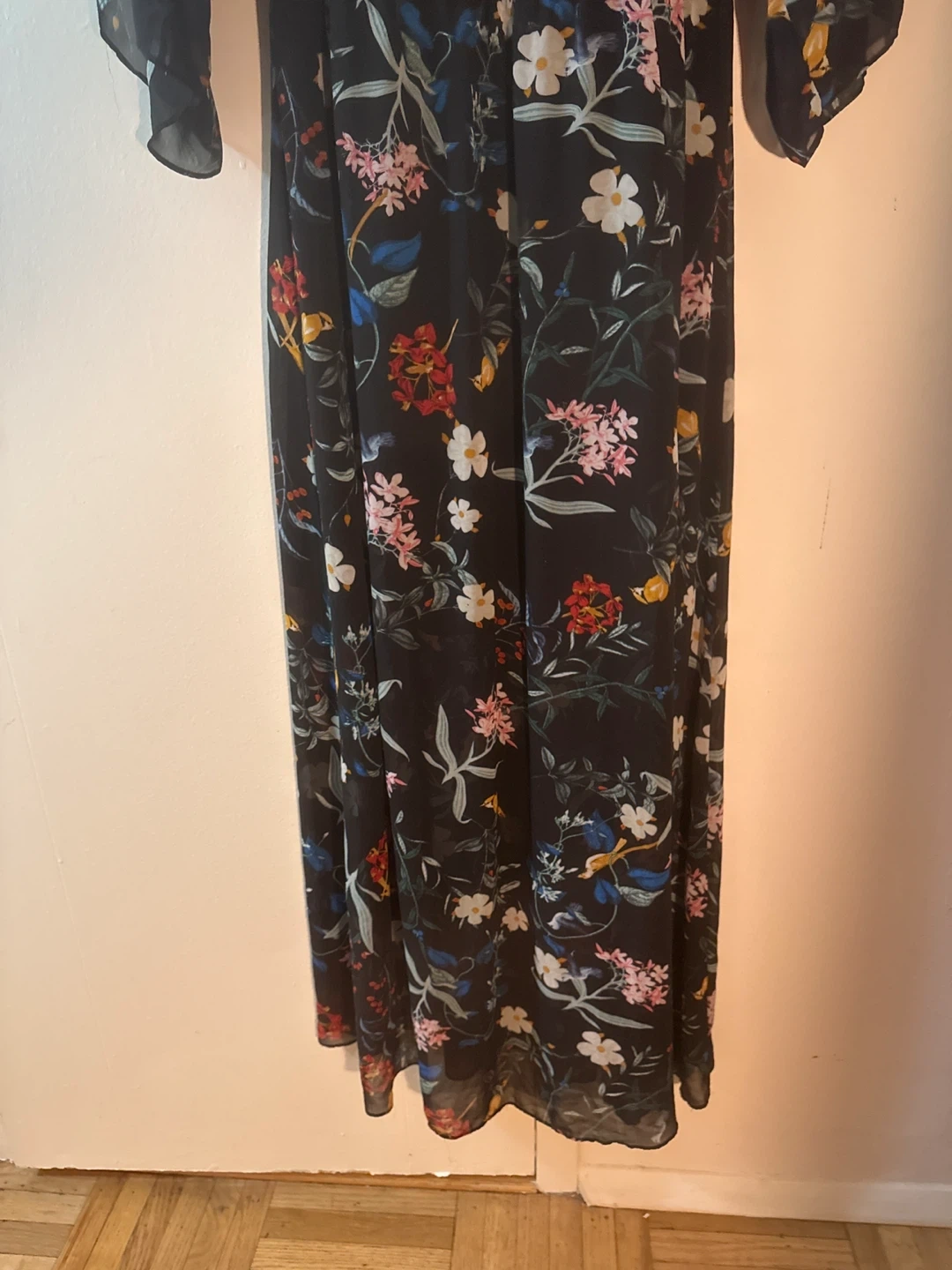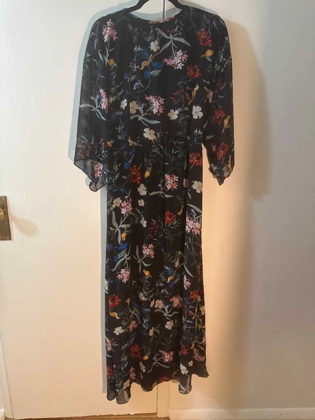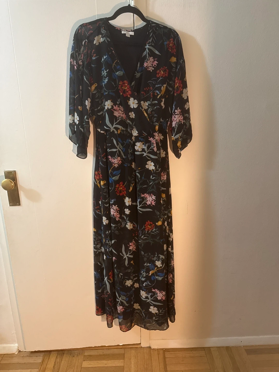 Selling a lovely floral maxi dress from New York & Company in size L. It features a beautiful floral pattern on a black sheer background. Could wear it out but could wear it as a lounge dress. Fully lined with a stretchy black material. Snap at the breastbone. Shows minimal signs of wear if any. Comes with a belt with the patterned material. Will try to find it