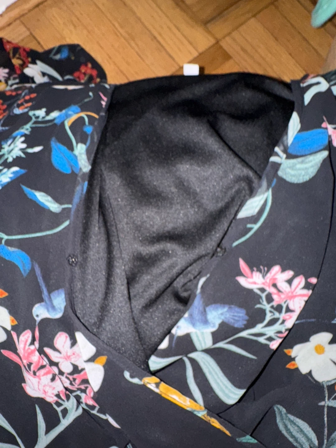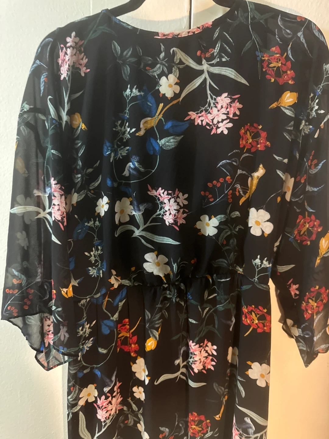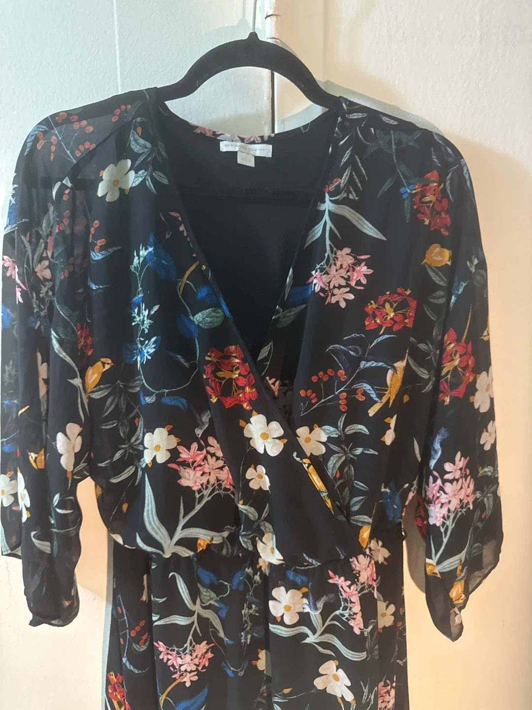 Selling a lovely floral maxi dress from New York & Company in size L. It features a beautiful floral pattern on a black sheer background. Could wear it out but could wear it as a lounge dress. Fully lined with a stretchy black material. Snap at the breastbone. Shows minimal signs of wear if any. Comes with a belt with the patterned material. Will try to find it