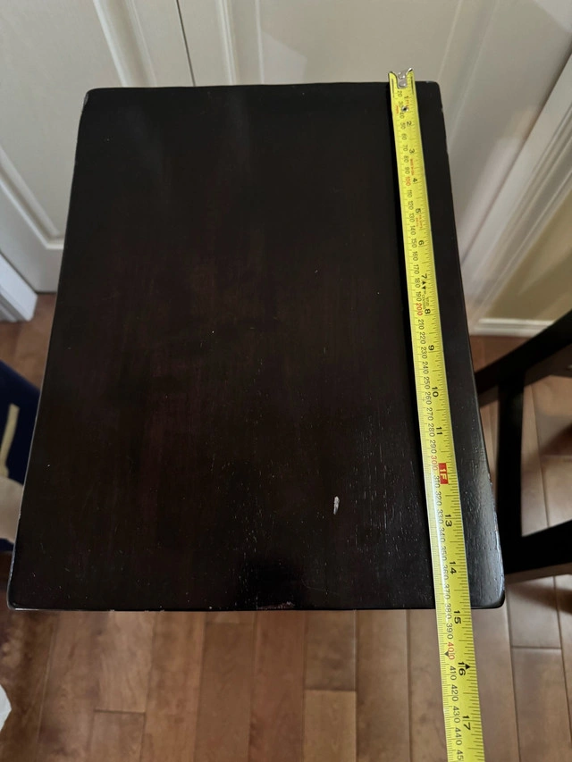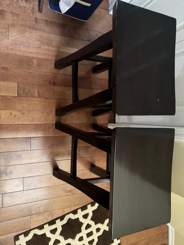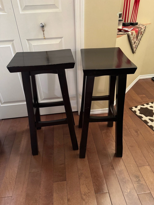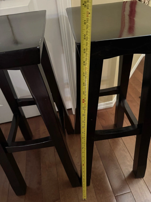 67Dark brown wooden bar stools, each standing 32 inches tall and featuring a smooth seat, perfect for adding a touch of modern elegance to your home. These stools have a minor scratch on top (as shown in the pictures). * **Height:** 32 inches If the ad is up, the stools are available!