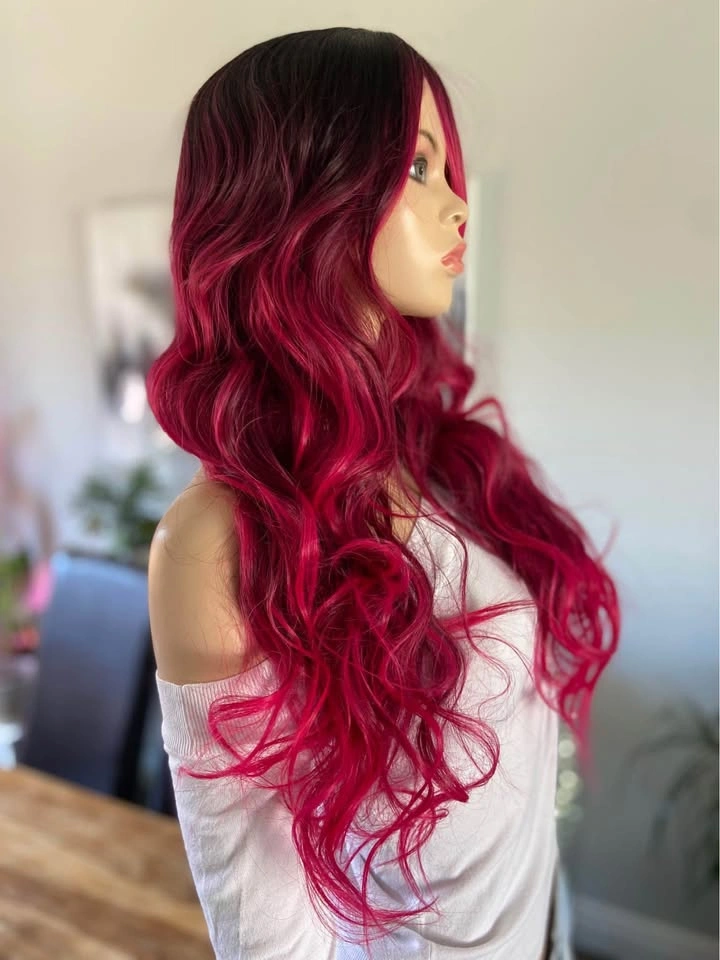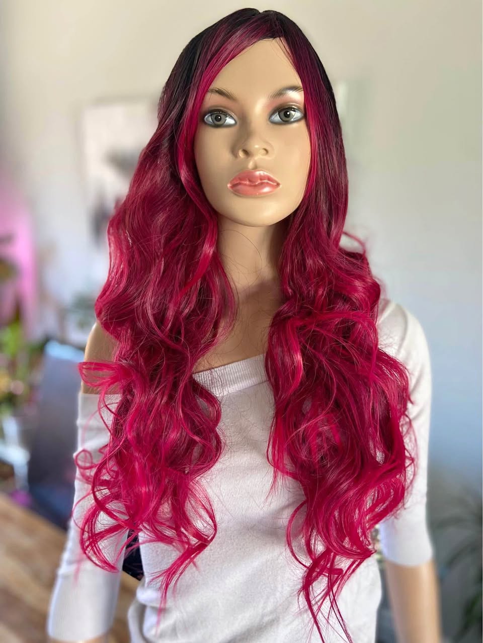 NWOT28” Long Wavy Curly Gradient Hot Pink Ombré Synthetic Wig w/ Bangs (2285)