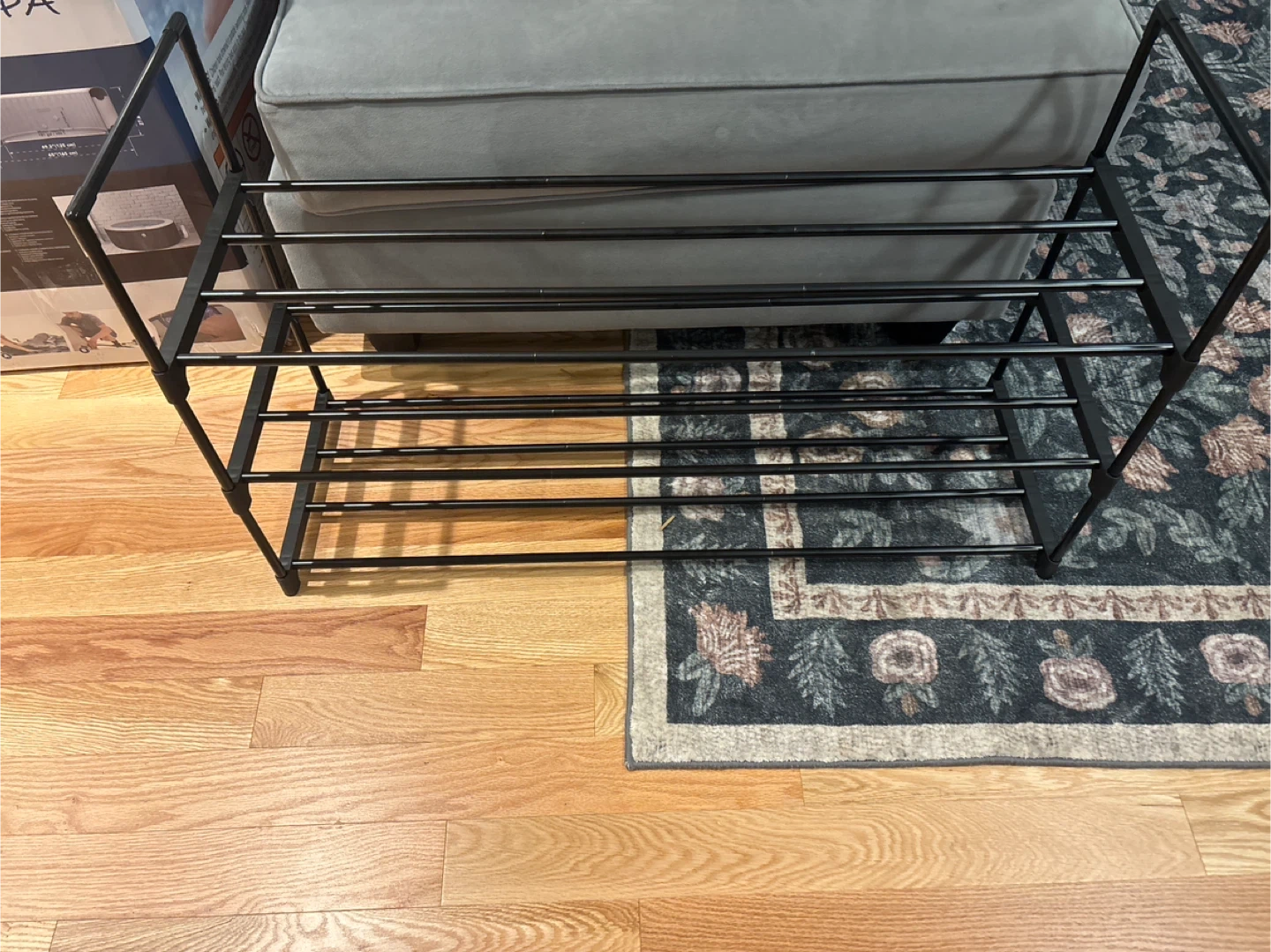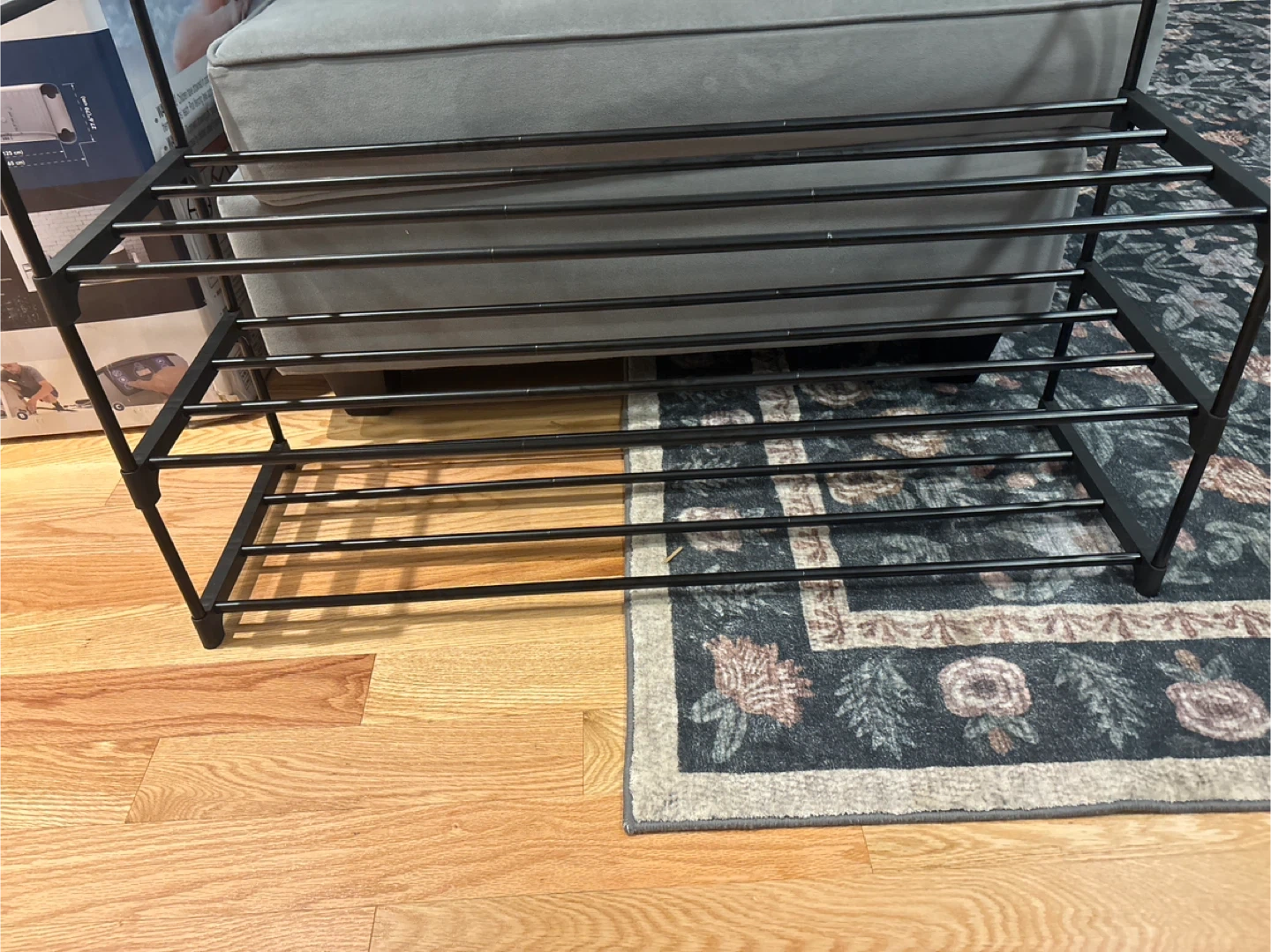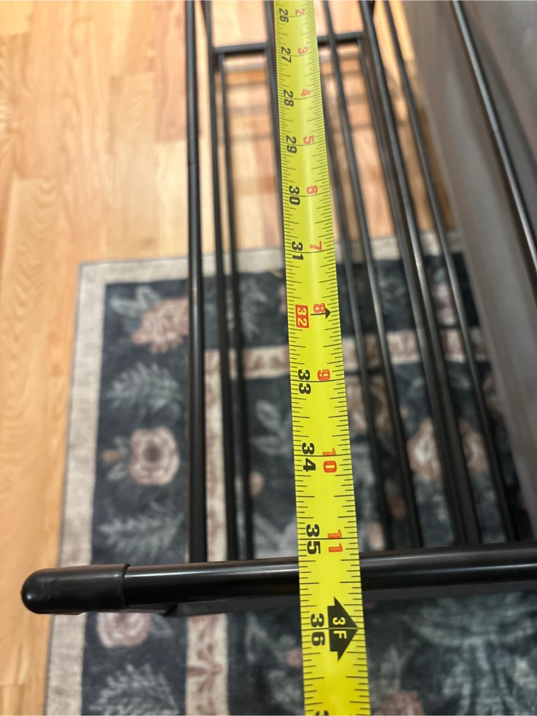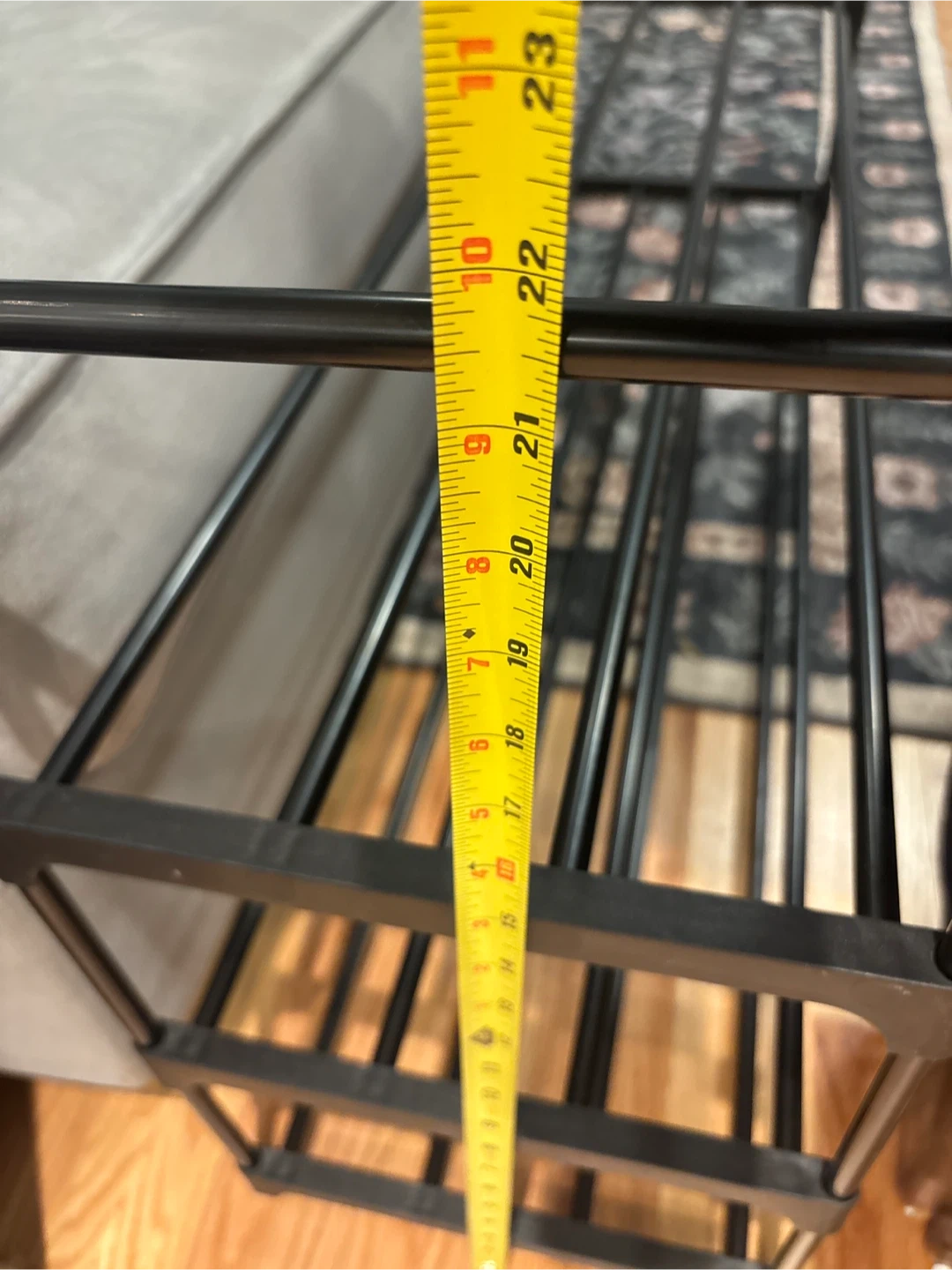 226Selling a handy metal shoe rack that's perfect for keeping your entryway tidy! It's black and has 3 tiers, so lots of space for all your footwear. The rack measures approximately 36 inches in height, and 22 inches in width.