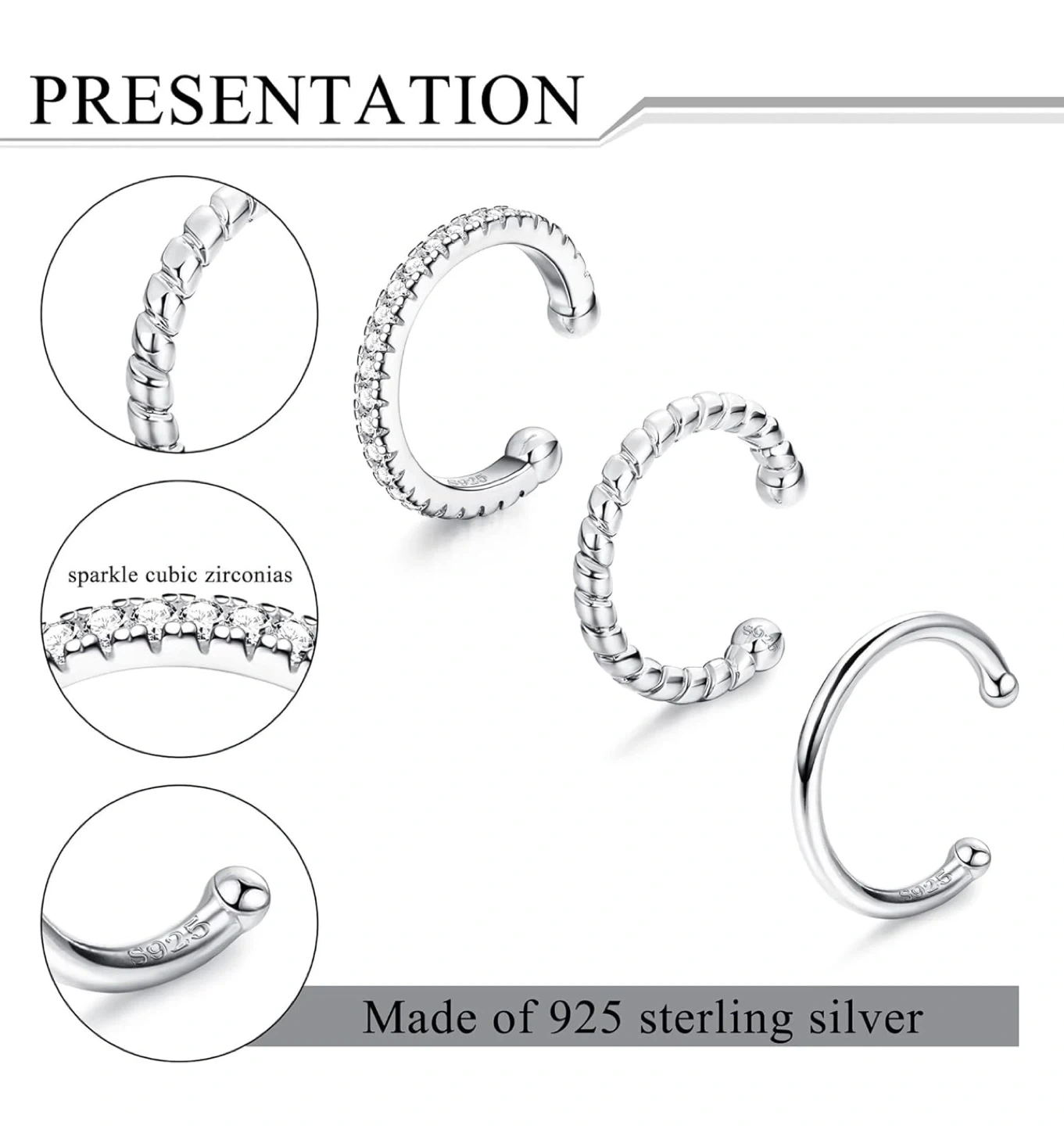 67Selling a brand new set of sterling silver ear cuffs! These are made of 925 sterling silver and feature sparkle cubic zirconias. They're a stylish and comfortable addition to any jewelry collection