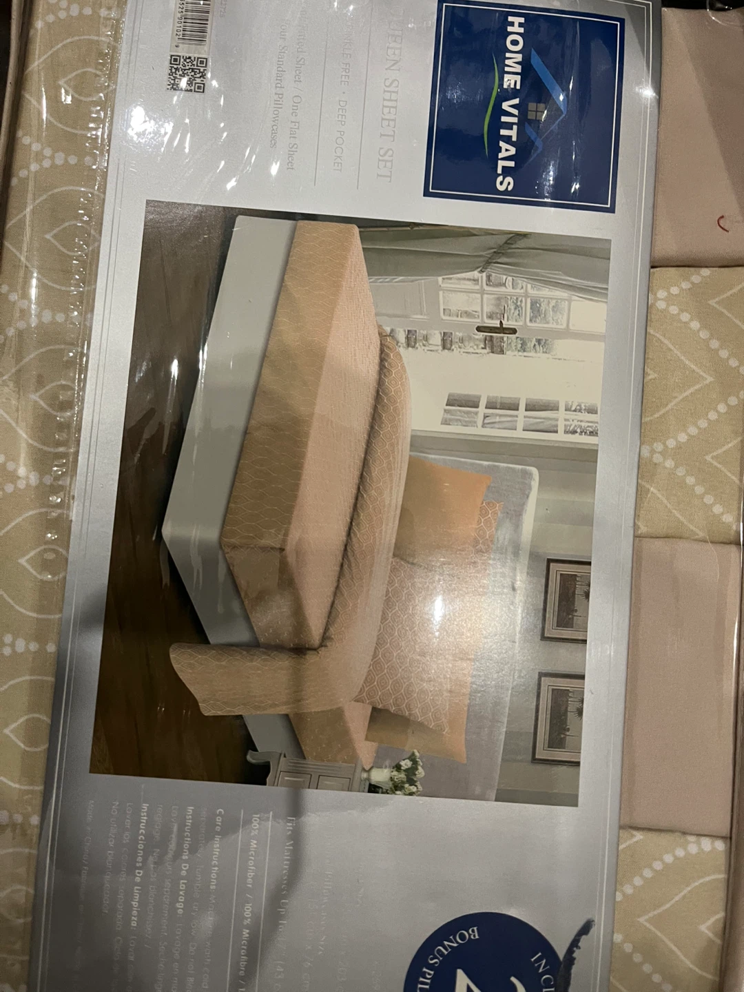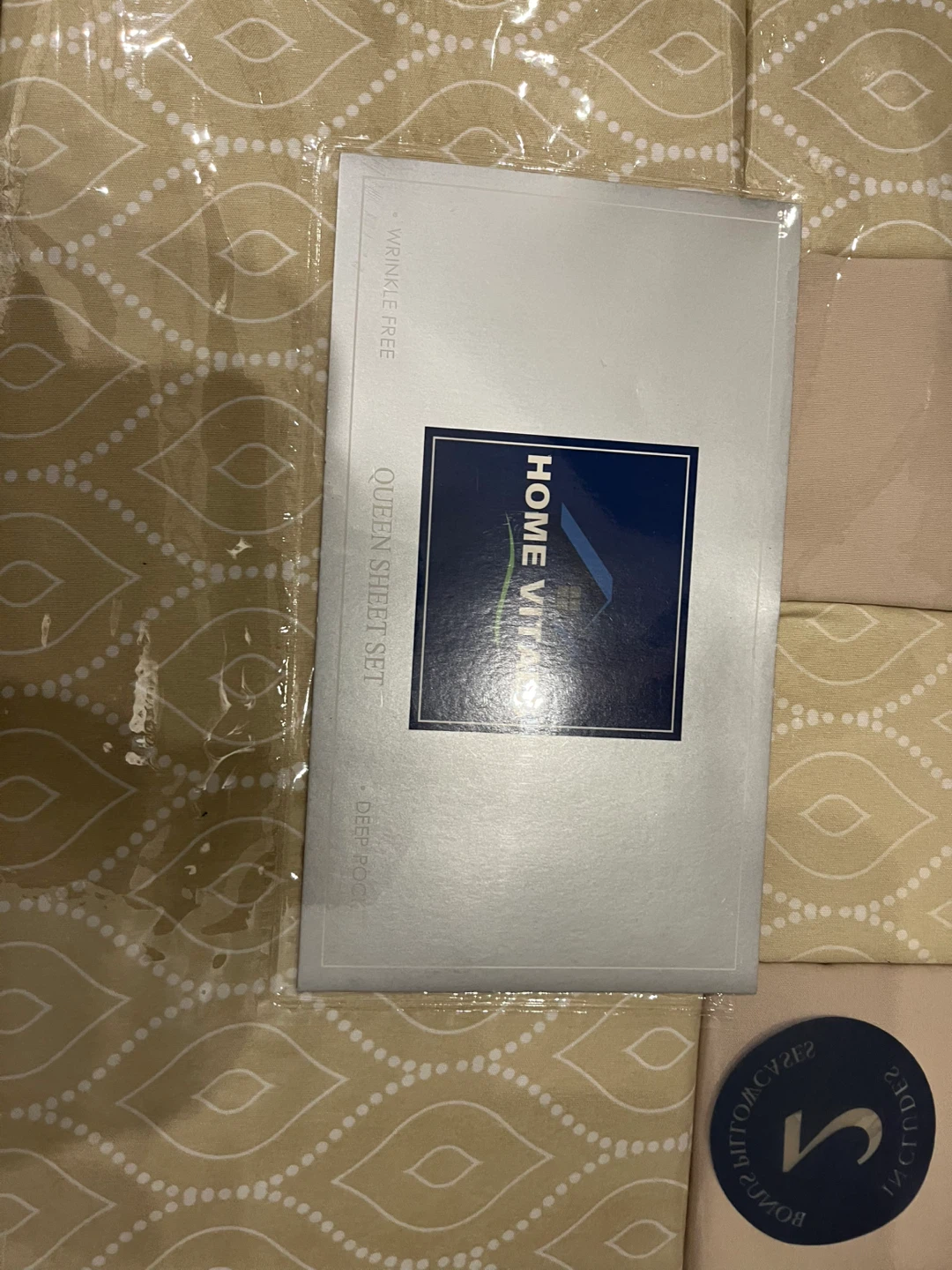 Selling a brand new Home Vitals queen sheet set, still in its original packaging! This set includes a fitted sheet, a flat sheet, and four standard pillowcases. It's wrinkle-free and has a deep pocket design for a snug fit. Perfect for adding a touch of elegance to your bedroom!