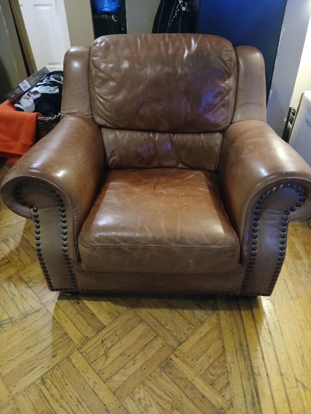 Selling a comfy brown leather armchair. It has a classic design with studded detailing on the arms. It's in good condition and perfect for a cozy reading nook or living room.
