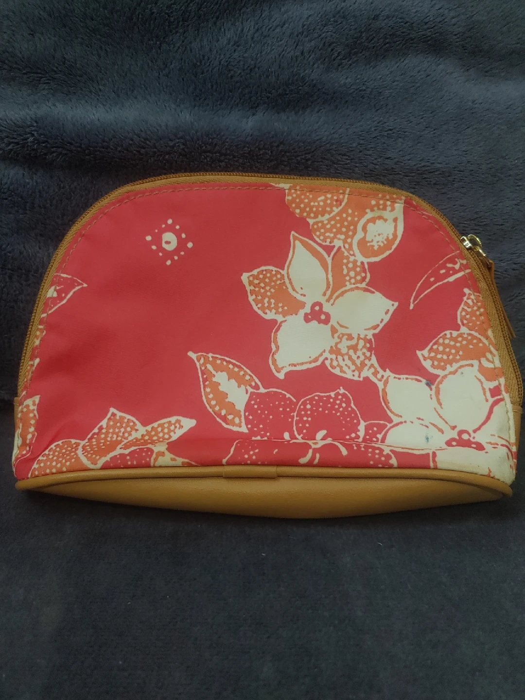 Here's a cute Estee Lauder cosmetic bag! It's in great shape and ready to hold all your essentials. The bag features a vibrant coral and white floral pattern on the outside, with a matching coral lining inside. The zipper pull has the Estee Lauder logo.