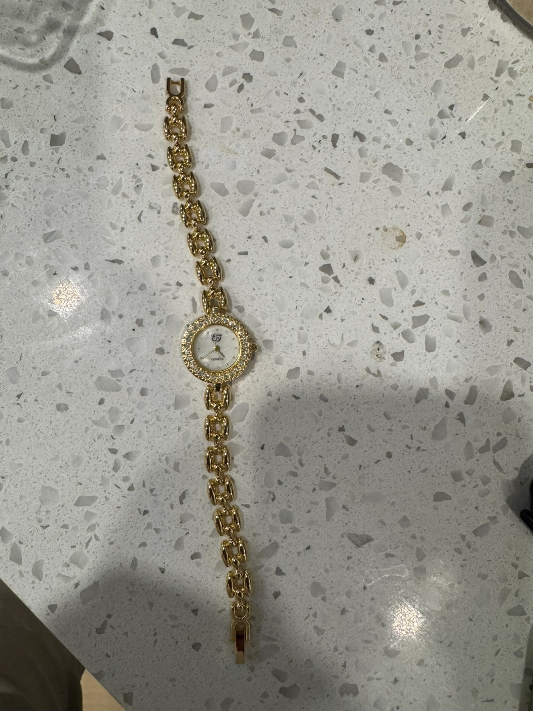 121This is a lovely gold-tone quartz watch. It's in great condition and ready to wear. The watch features a beautiful chain-link bracelet and a classic round face. Perfect for adding a touch of elegance to any outfit!