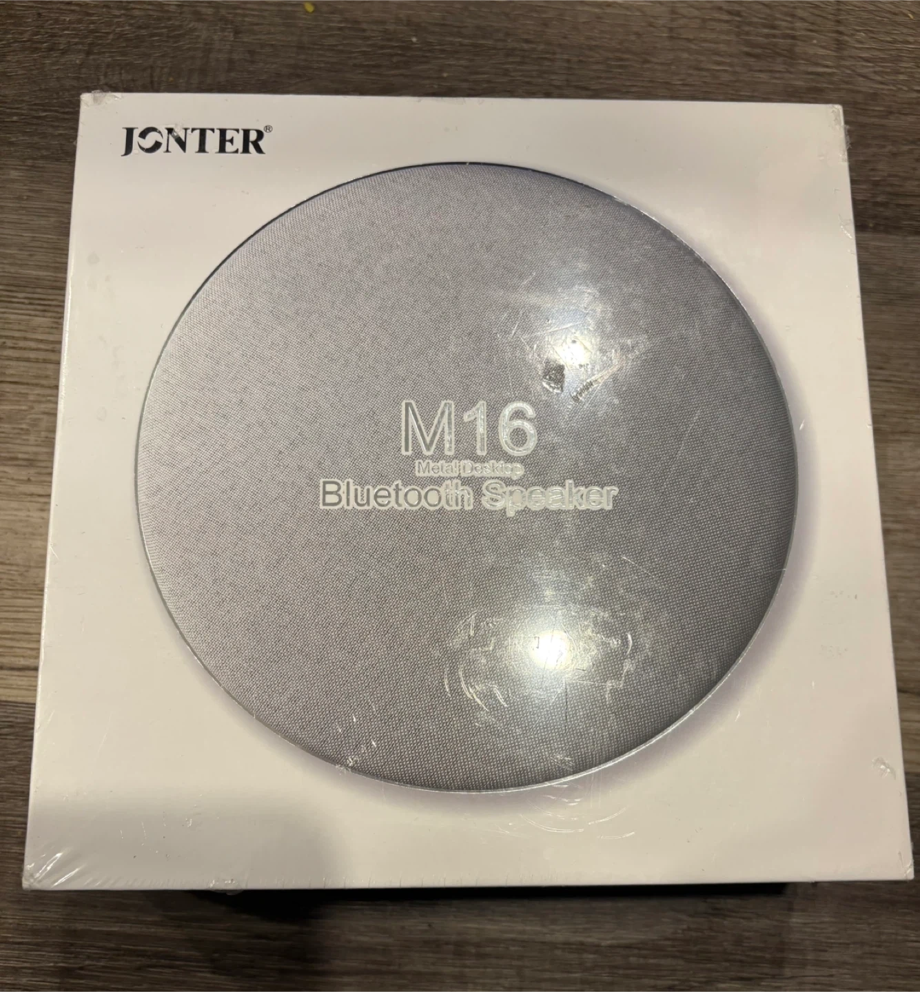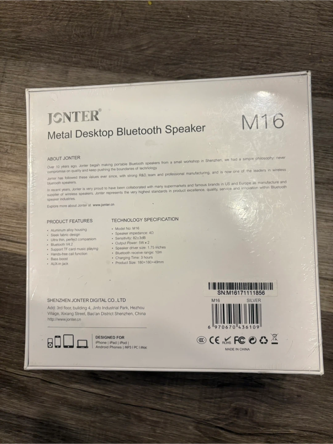 548Selling a JONTER M16 metal desktop Bluetooth speaker in silver! It features: - Aluminum alloy housing - Sleek fabric design - Compatible with most devices - Bluetooth V5.0 - TF memory card music playing - Hands-free call function - FM radio - AUX-in jack The box includes the speaker and all original packaging
