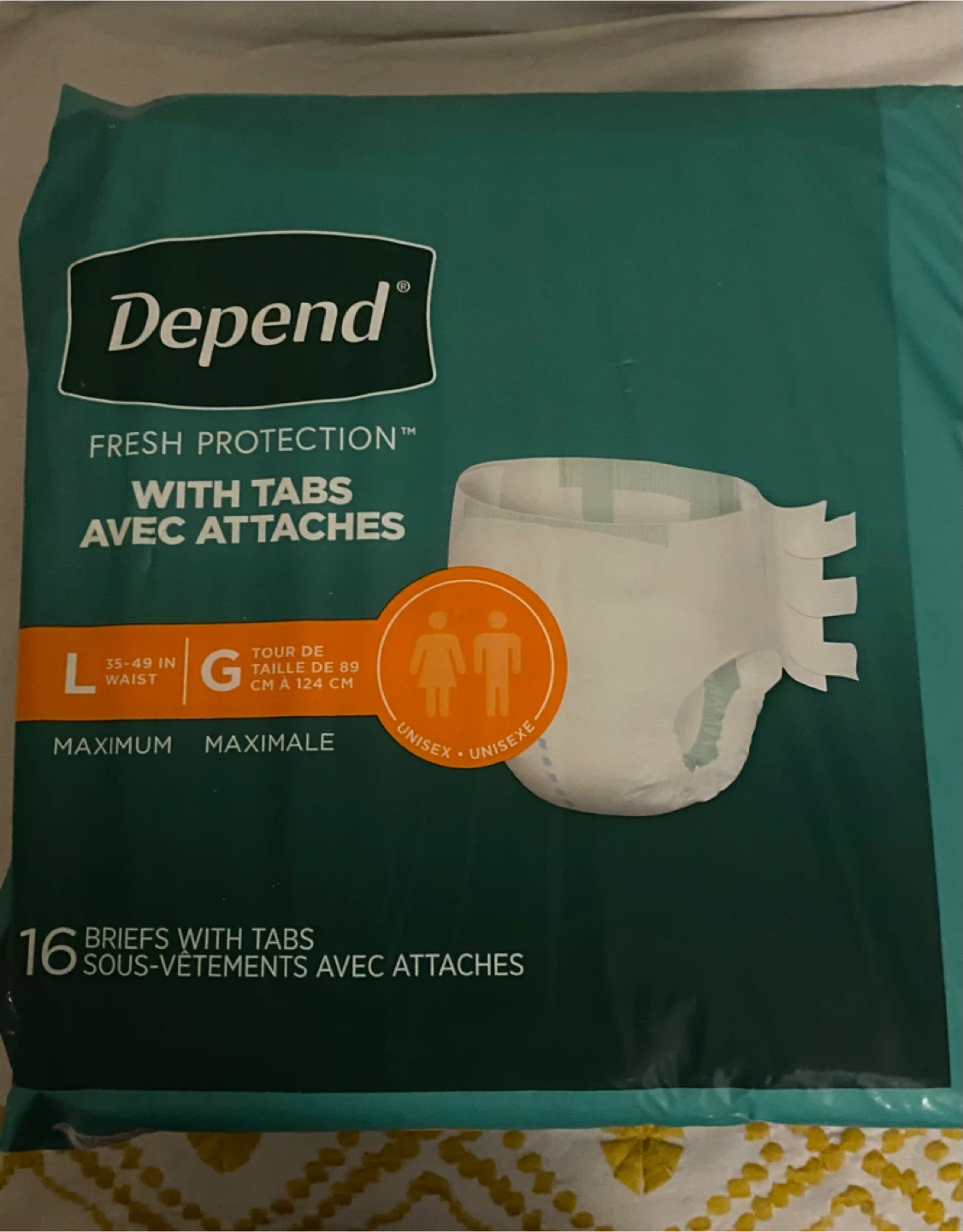 Selling a pack of Depend Fresh Protection briefs with tabs. These are size L, suitable for a 35-49 inch waist (89-124 cm). They're unisex and designed for maximum absorbency. The pack contains 16 briefs.