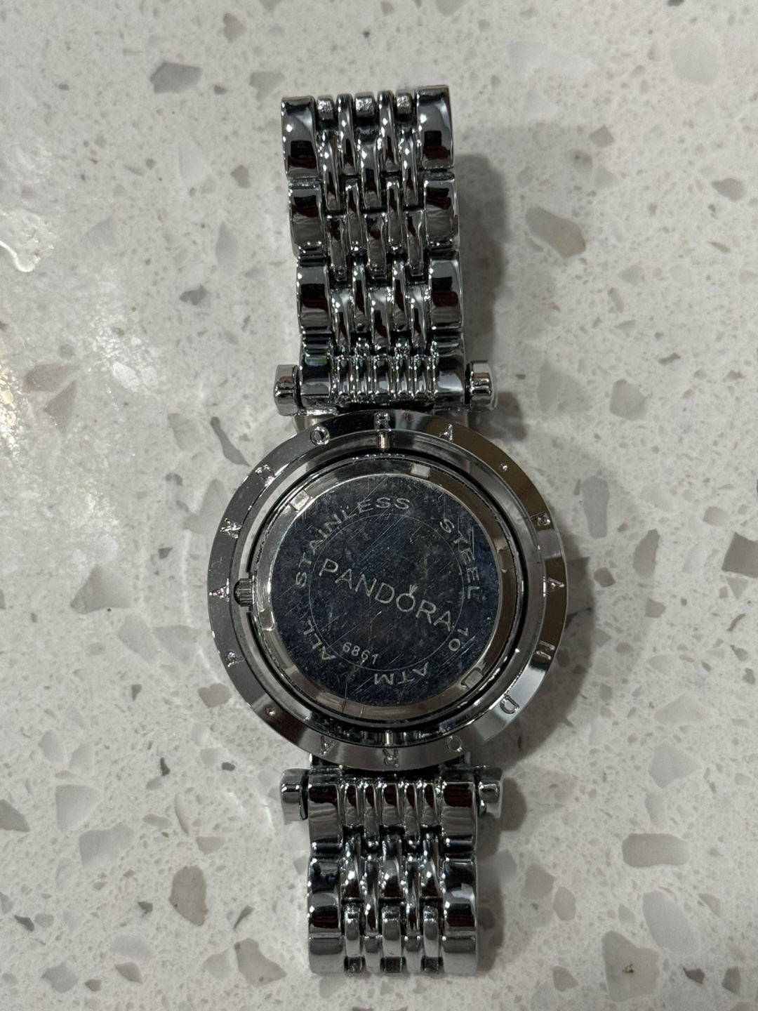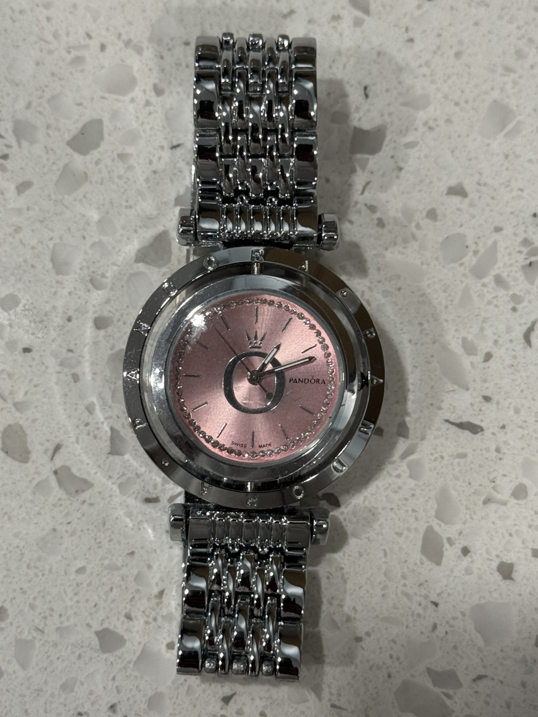 Selling a lovely Pandora watch with a stainless steel band and a pretty pink dial. It's in great condition and ready for a new home! The back of the watch is also stainless steel.