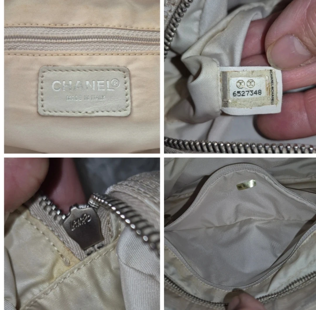 Features: Chanel beige monogram jacquard canvas body. Double color coordinated flat leather top straps. Full zip top with brushed silver Chanel stamped zipper pull. Spacious interior compartment lined in beige nylon with long sidewall zip pocket. 4 bottom footings. Made in Italy.