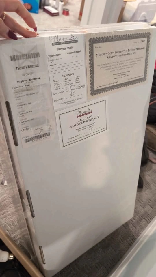 Timeless gown featuring exquisite hand-beaded rhinestones and embroidery across the bodice and train. The structured corset-style top enhances the waist, while the soft flowing skirt gives a romantic, elegant silhouette. Professionally cleaned and preserved immediately after the wedding and kept sealed ever since — no yellowing, no stains, no odour. Includes preservation box for safe storage. Stored in a smoke-free, climate-controlled home. Pickup in Richmond Hill (Harding and Yonge).