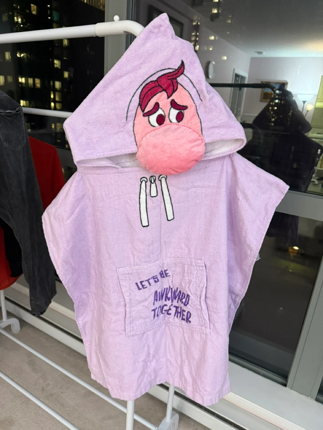Super cute hooded towel poncho featuring Disgust from Inside Out! The poncho is light purple and has a pocket that says "Let's be awkward together"!