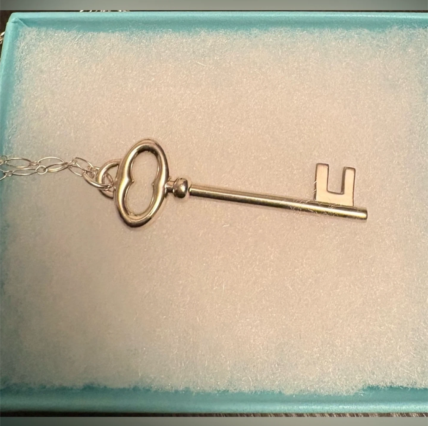 Tiffany & Co. Sterling Silver Key Pendant Necklace. Length of Chain is 18”. Hardly worn. Has been professionally cleaned and in excellent condition. Includes iconic Tiffany blue box and pouch.