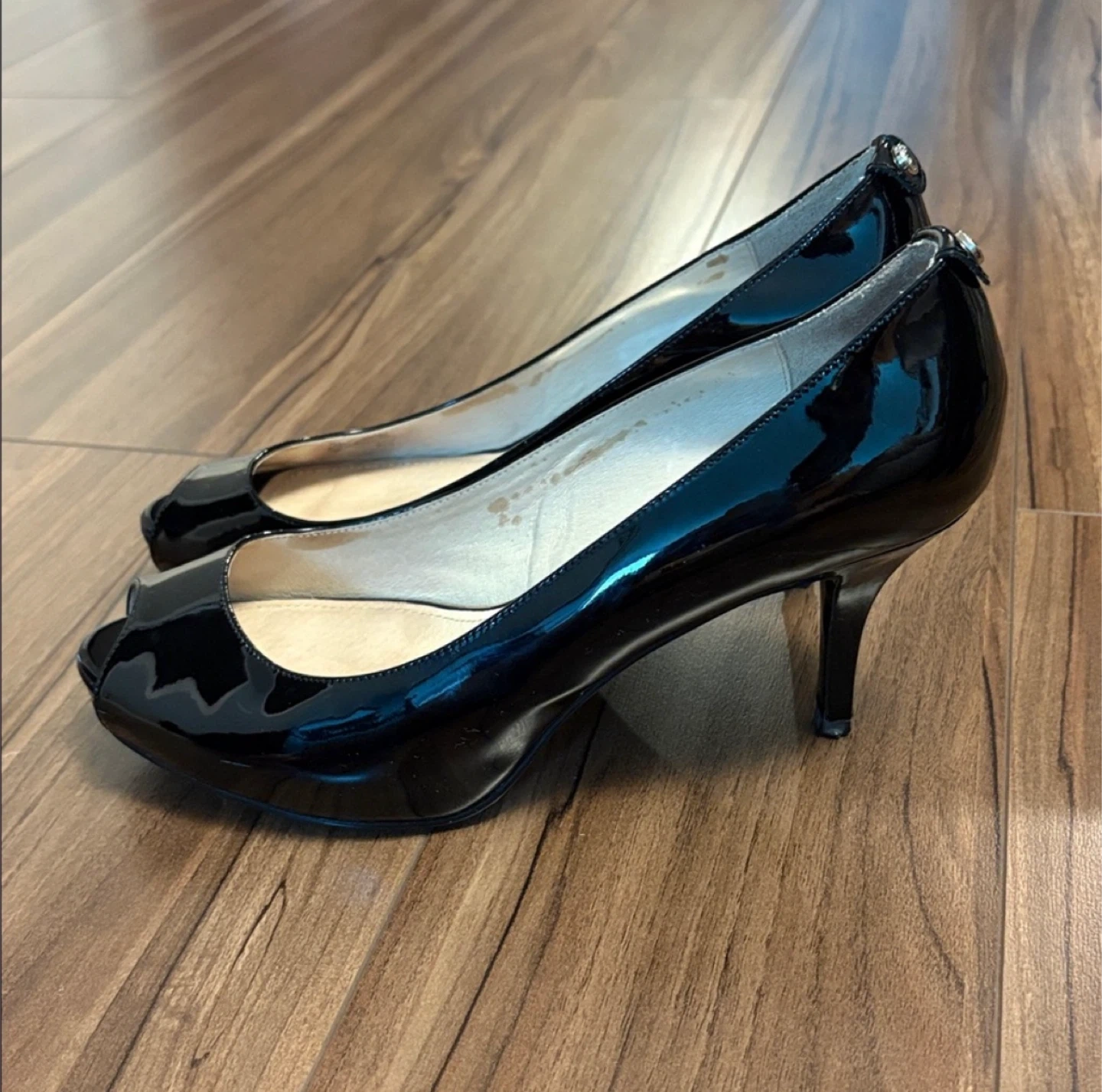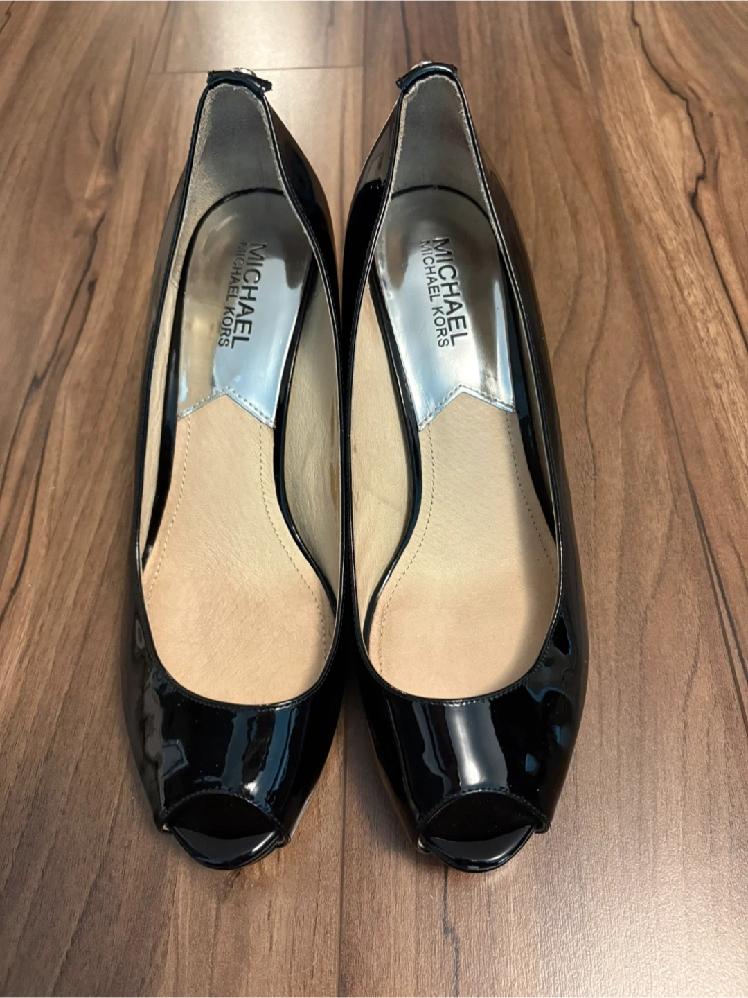 126Michael Kord black peep toe heels with a glossy finish. US Size 7.5. Worn only a handful of times and in excellent condition. Very comfortable and a classic style. Heel is 2.5” inches.