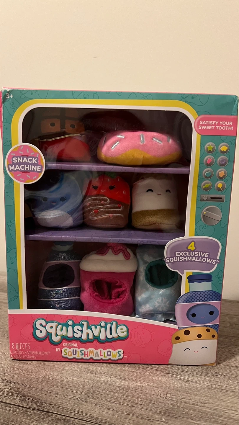 This Squishville by Squishmallows Snack Machine set comes with 8 pieces! It includes 4 exclusive Squishmallows and Squish costumes, so you can have lots of fun creating your own little world
