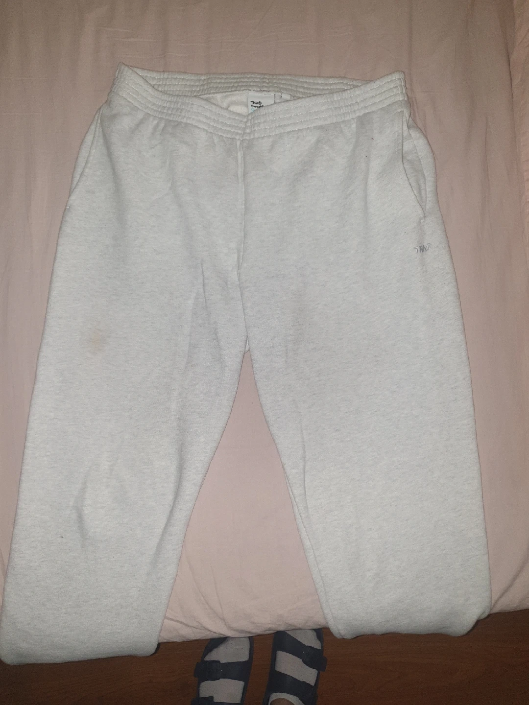 Selling a pair of TNA Sweatfleece Cozy Fleece sweatpants in a light grey colour. They're a size large and in great condition! Perfect for lounging around or running errands. Never used before!!!