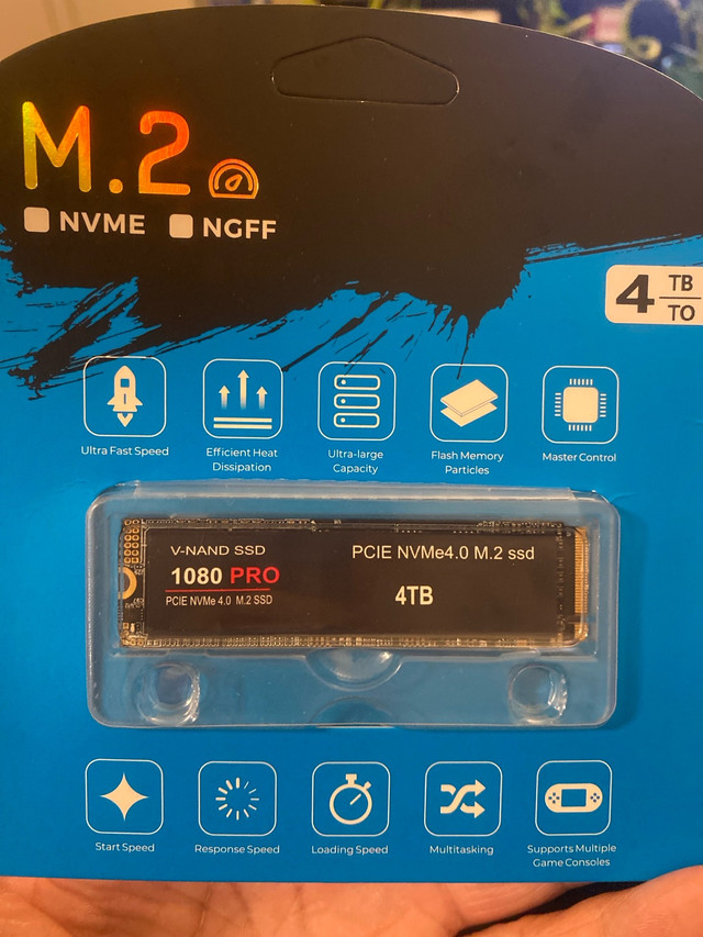 Get ultra-fast speeds with this new 1080 Pro 4TB NVMe M.2 SSD, perfect for upgrading your PC or game console. This SSD features efficient heat dissipation, ultra-large capacity, and supports multiple game consoles. Additional specifications: * V-NAND SSD * PCIE NVMe 4.0 M.2 SSD * 4TB Capacity This SSD is brand new and looking for a good home. It's so new, it still has that fresh-out-of-the-package smell! If the ad is up, it's available!