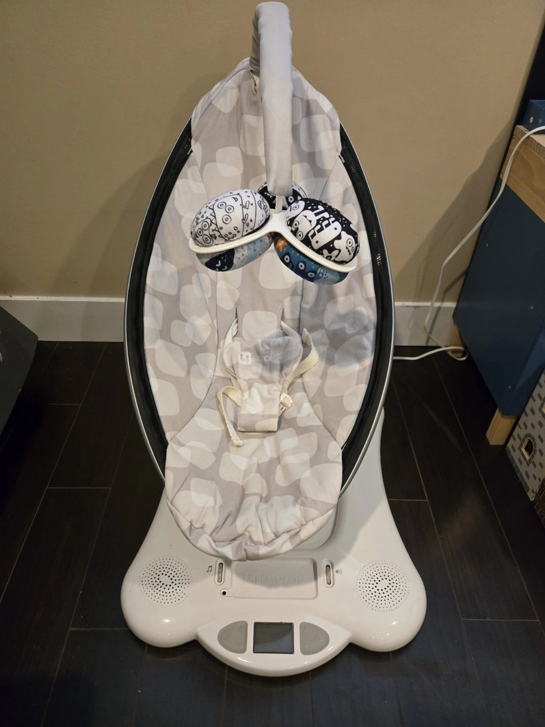 Free 4moms MamaRoo baby swing. It's in great condition and has been well taken care of. This swing is perfect for soothing your little one with its various motions and sounds. It features multiple speeds and built-in nature sounds to help keep your baby calm and content