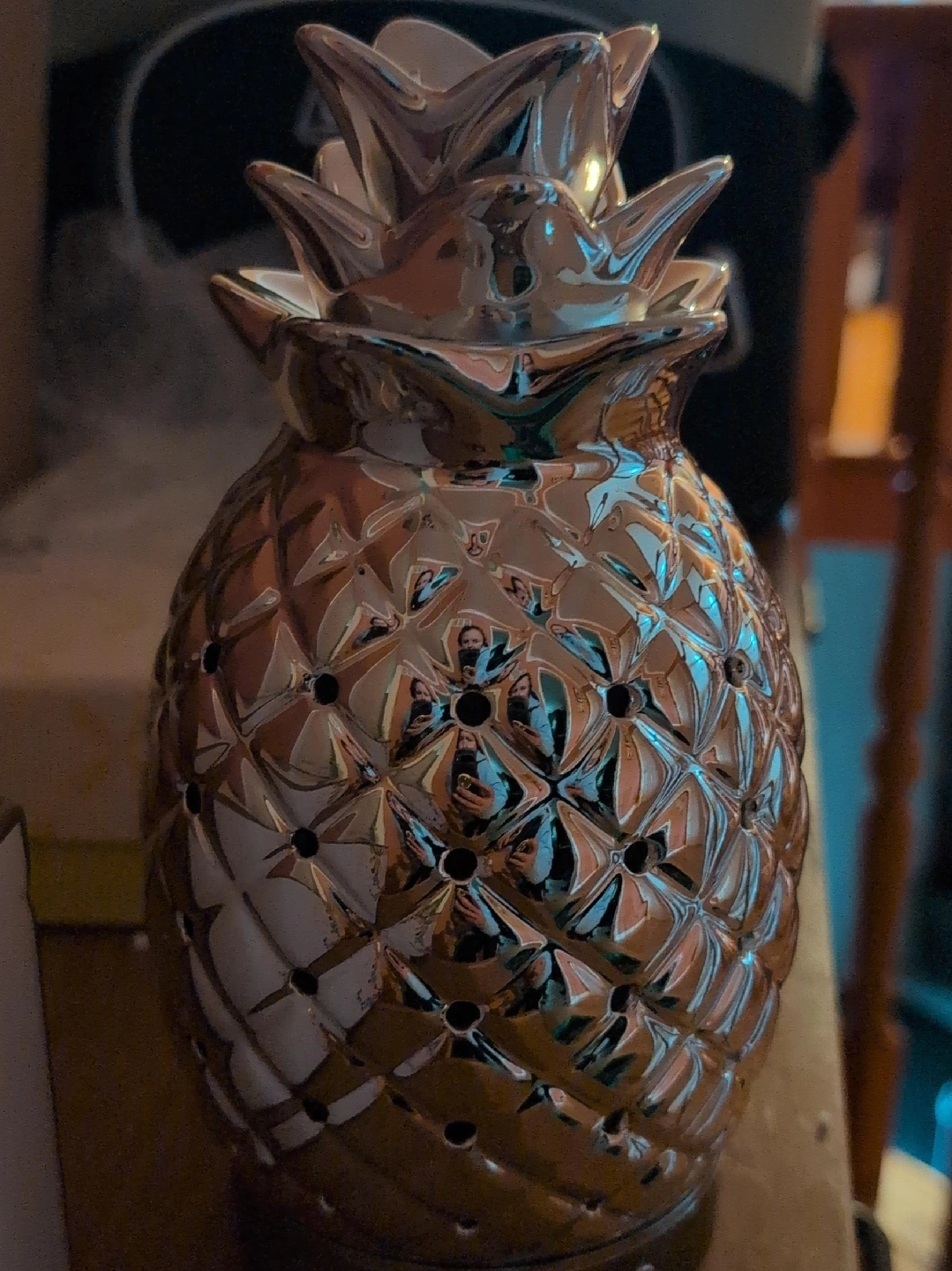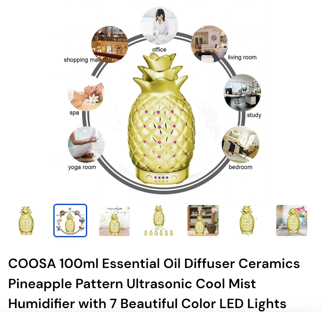 I'm selling a brand new COOSA 100ml essential oil diffuser in silver! It's perfect for adding a touch of elegance and aromatherapy to your living room. The diffuser is shaped like a pineapple, adding a unique and stylish touch to any space