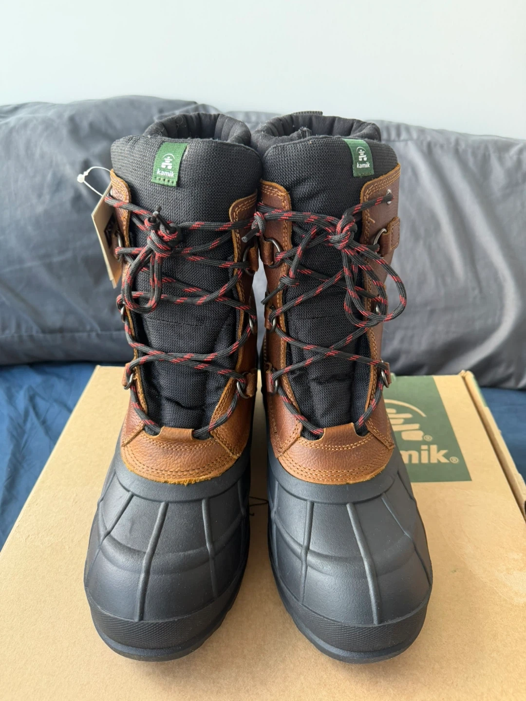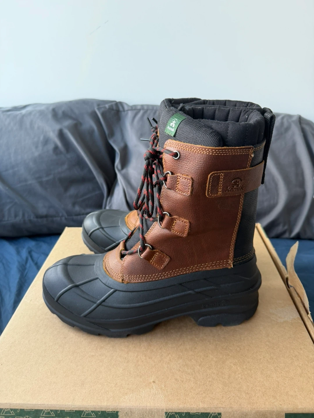 131Item Name: Kamik Abrough Plus Men’s Winter Boots – Size 11 Product Condition:Brand New, With Tags Pick Up Location: Jarvis and Gerrard Intersection Included: - Kamik Abrough Plus men’s winter boots (Brown/Black, Size 11, tags attached) - Original Kamik box and packaging Condition Notes: - Never worn – soles are pristine, uppers perfect. - Waterproof leather and seam-sealed construction - Comfort rated to -40°C, removable liner - Made in Canada quality Current Retail Price: $150 plus taxes Pickup Details: Available for pickup ONLY in Toronto. Cash or e-transfer accepted. No shipping or delivery. Lowballers will be ignored. Serious buyers only.