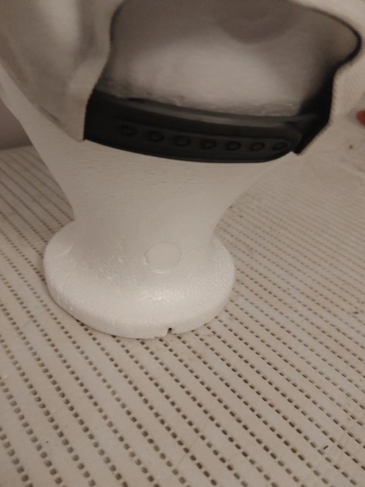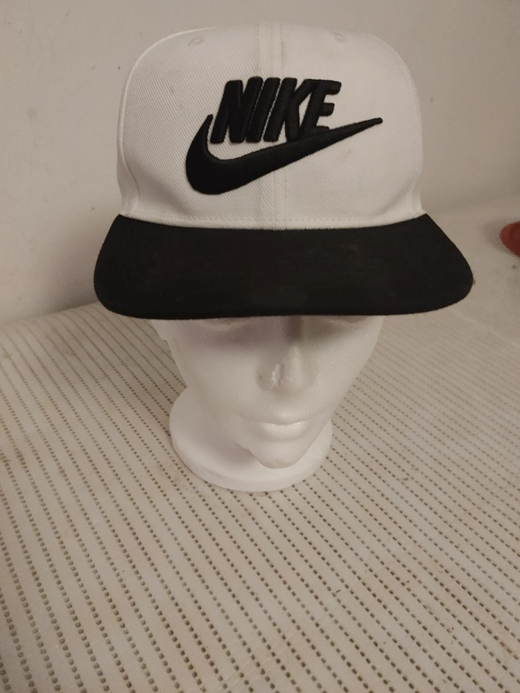 Selling a Nike child's cap, size 4-7. It's white with a black brim and the Nike logo in black. The material is 100% polyester. It's in great condition!