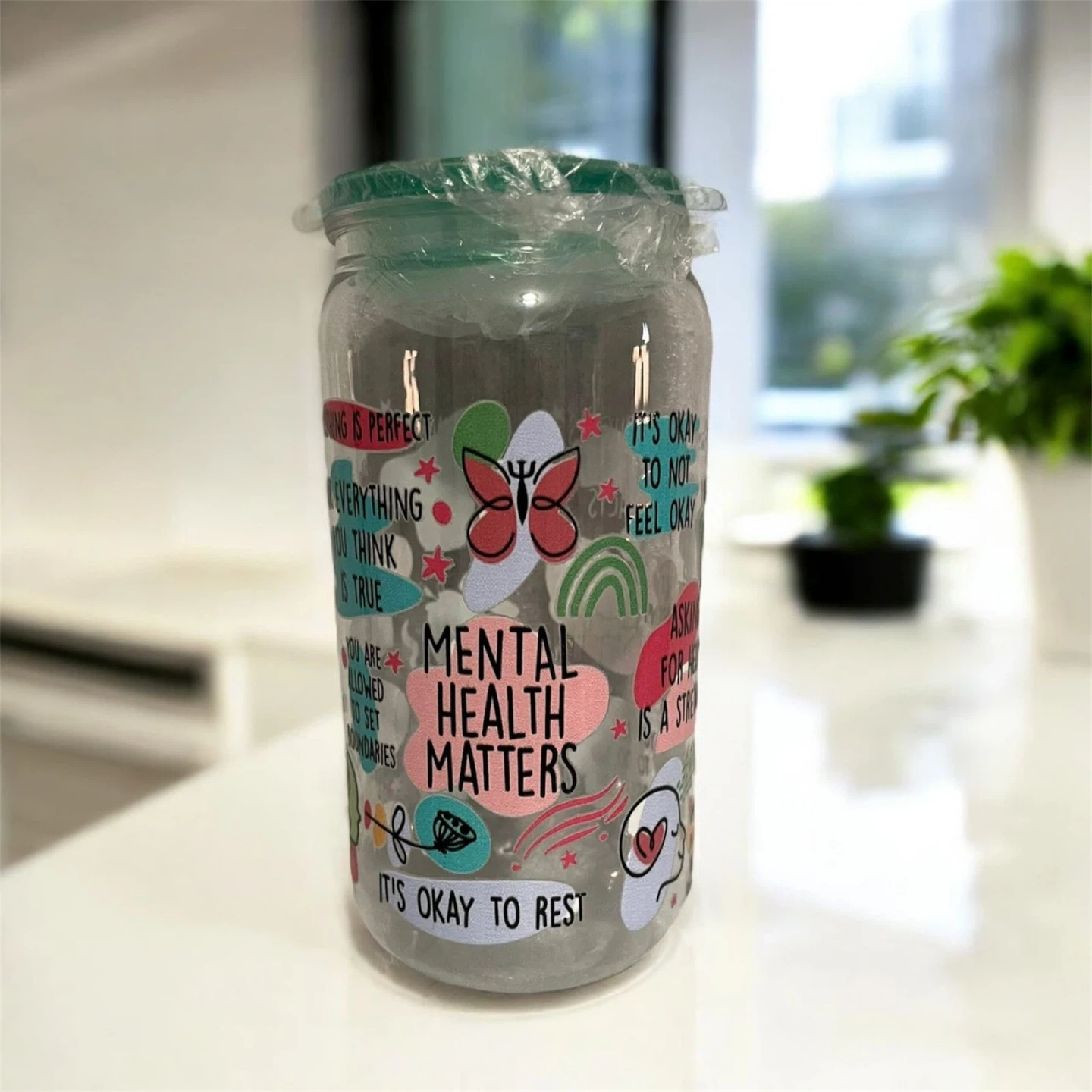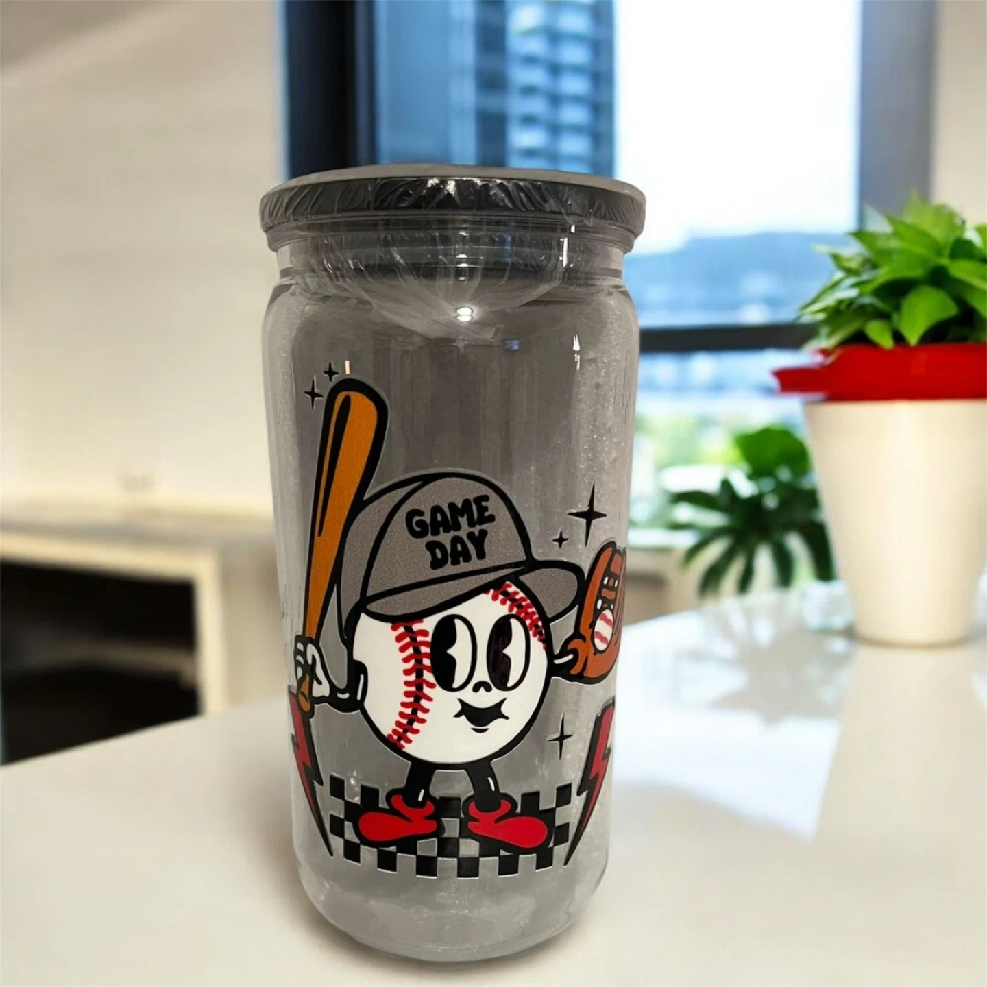 I'm selling a cute decorated plastic jar! It has various designs on it, including mental health messages, back to school supplies, and a baseball theme. Perfect for storing small items or adding a touch of fun to your space