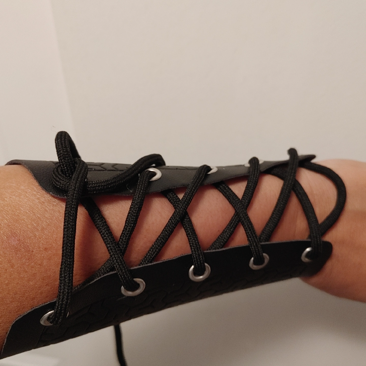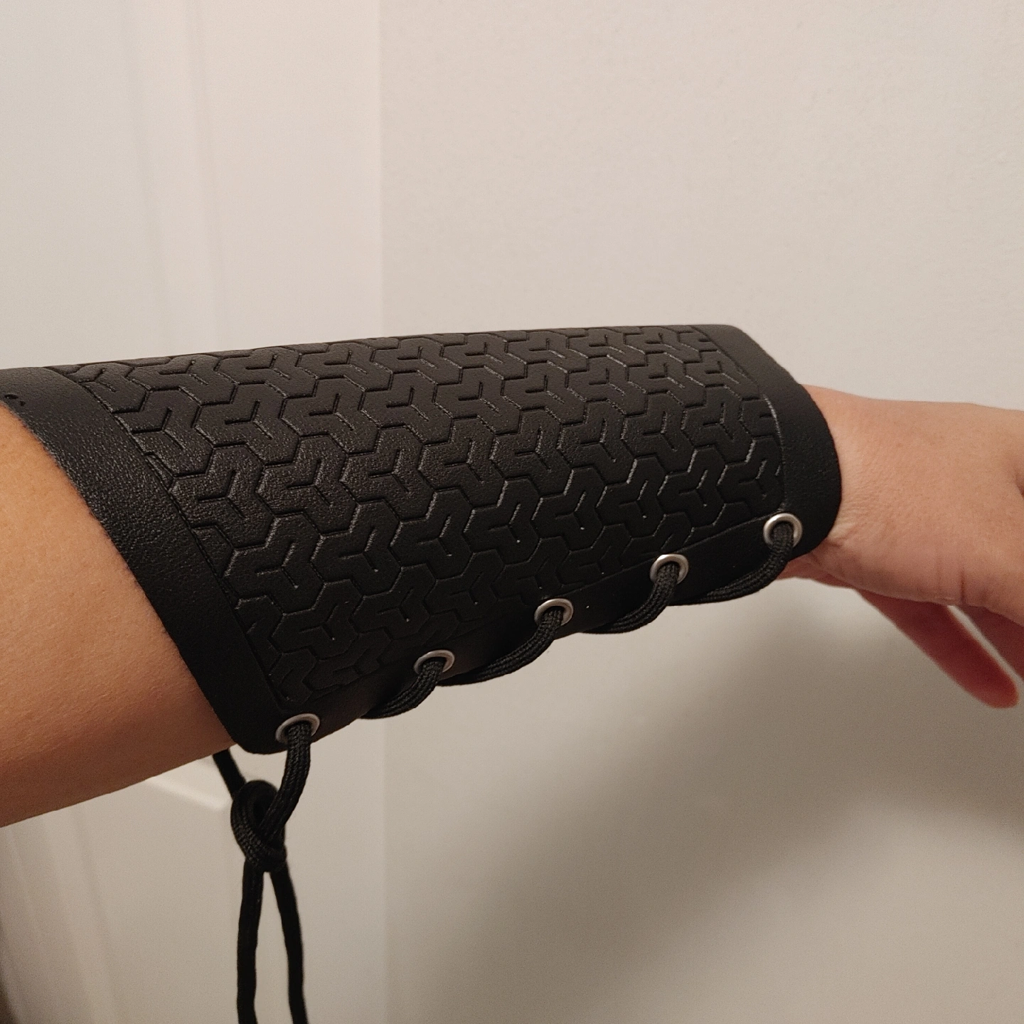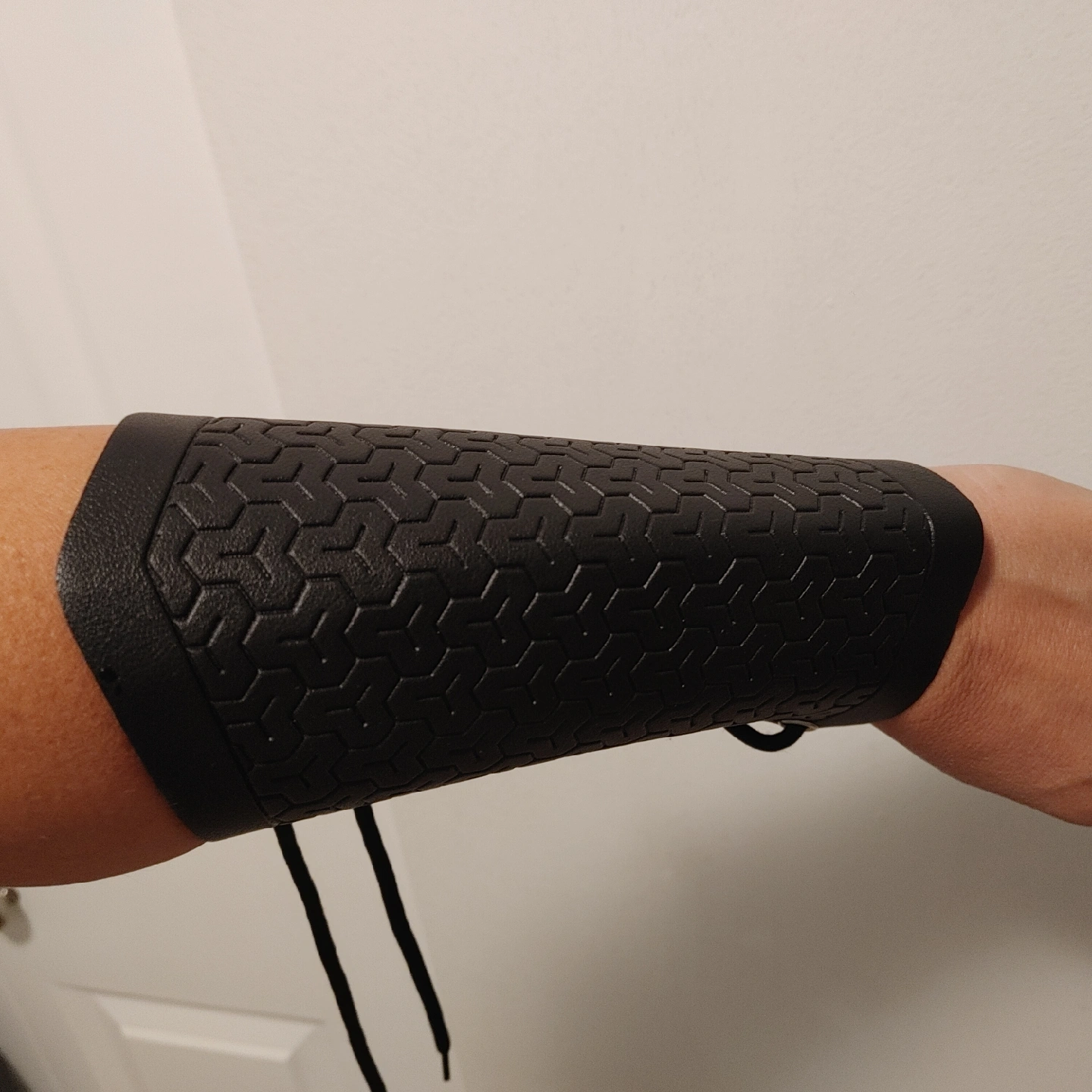 63Selling a black arm guard, looks to be in good condition! The guard has a honeycomb pattern and is laced up with black cord.