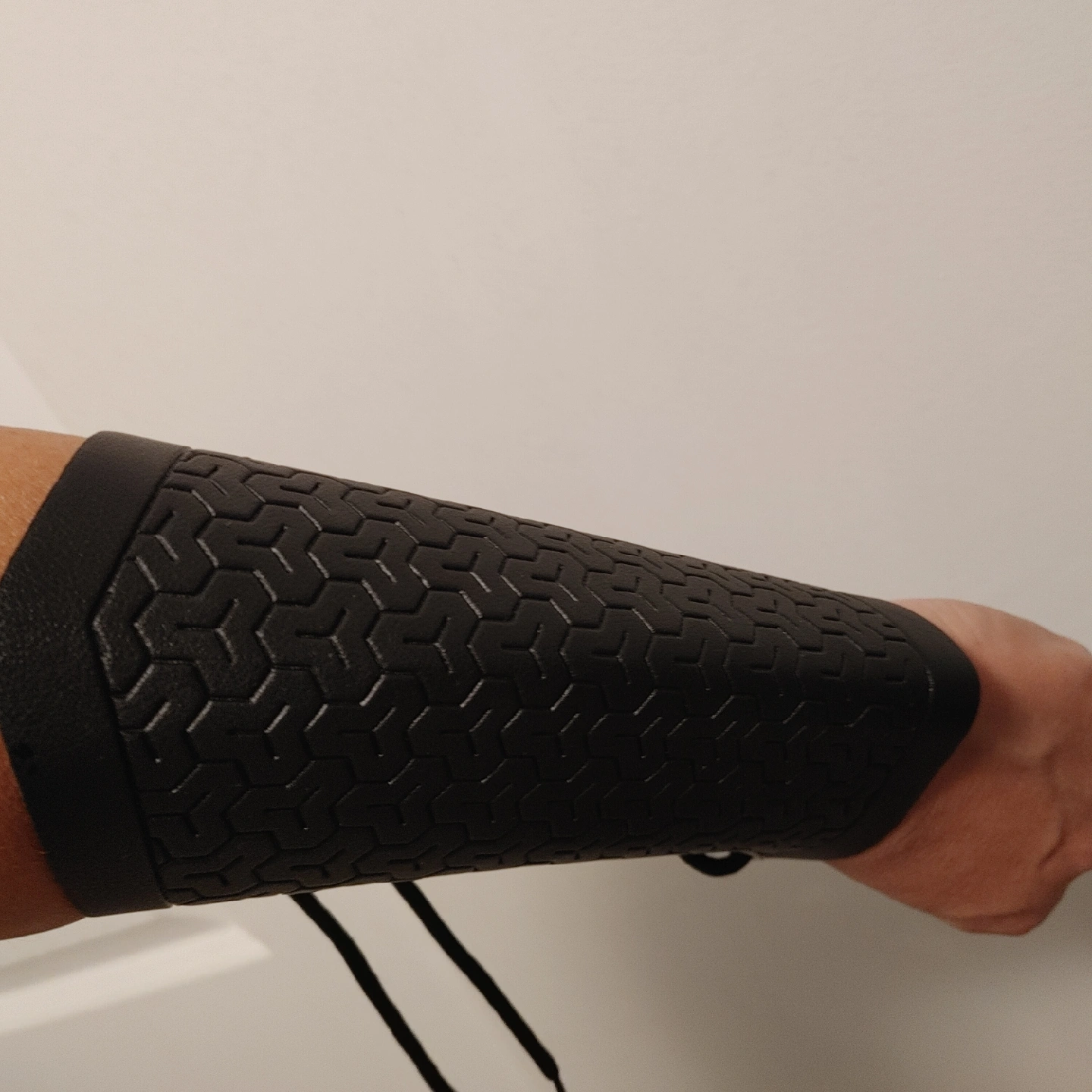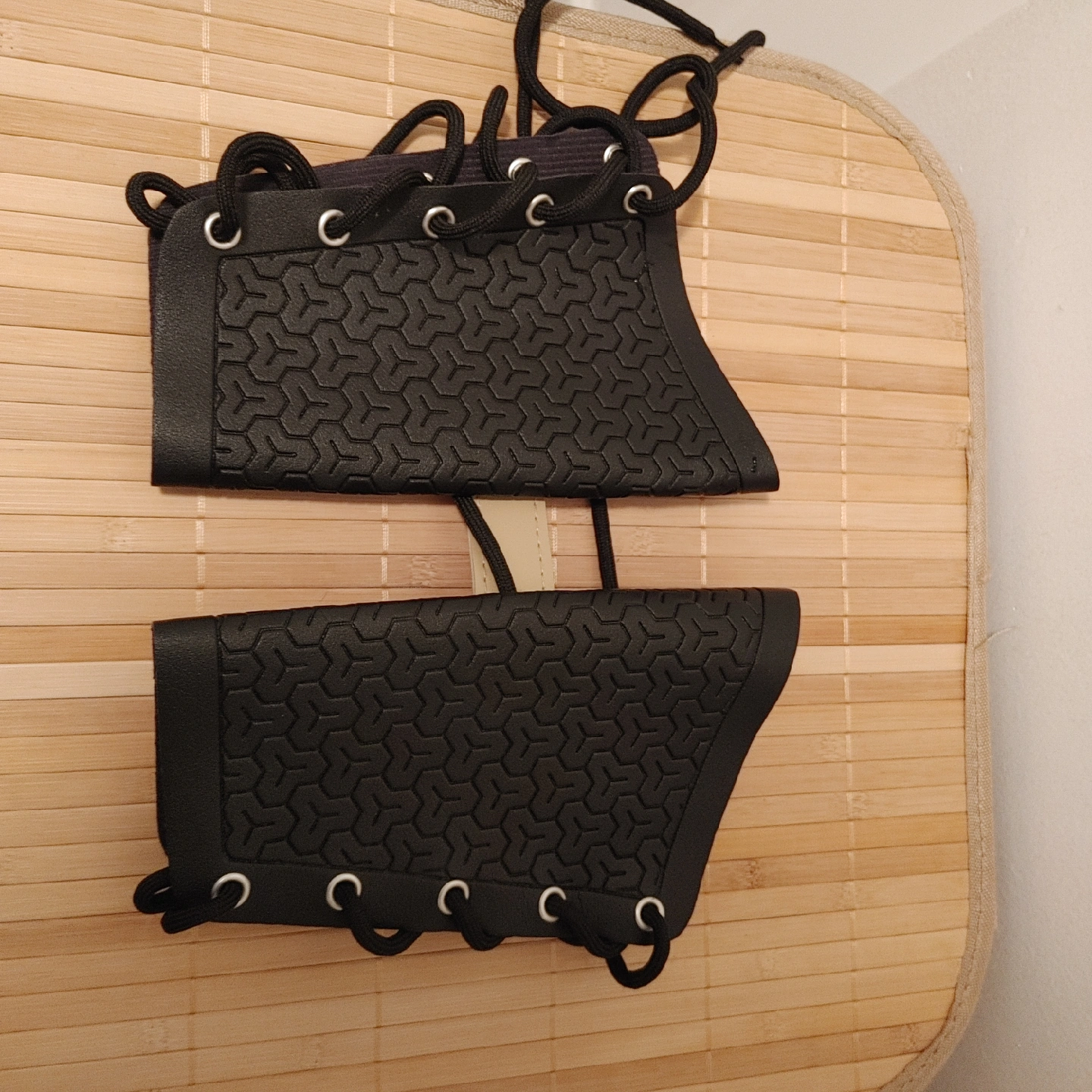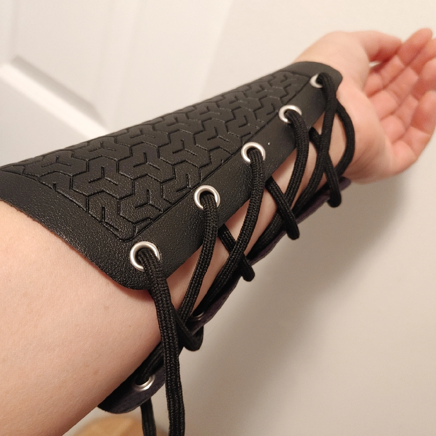 63Selling a black arm guard, looks to be in good condition! The guard has a honeycomb pattern and is laced up with black cord.