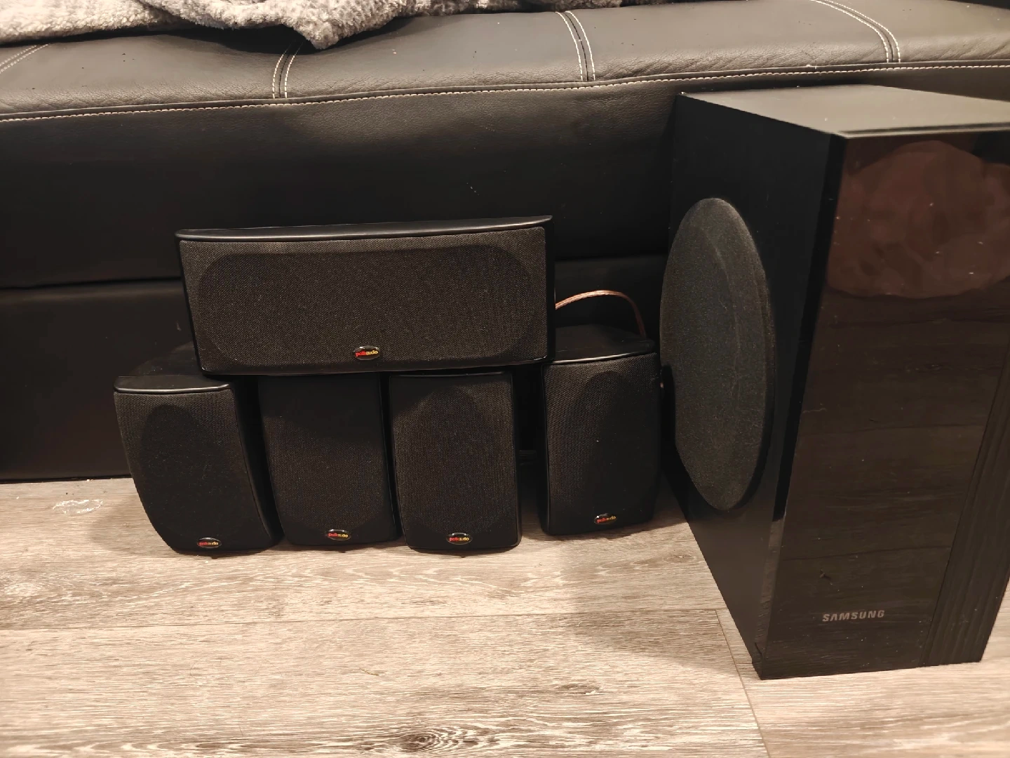 10Selling a Polk Audio surround sound speaker system. Includes a subwoofer and five satellite speakers to create a great home theatre experience. Great for movies or music!