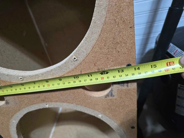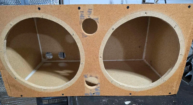 This is a raw speaker box ready for your custom audio project! It's a dual speaker enclosure, perfect for building your own sound system. Being sold as is. Cut for 12" subs. Box size is 28" x 14".